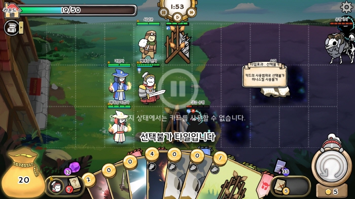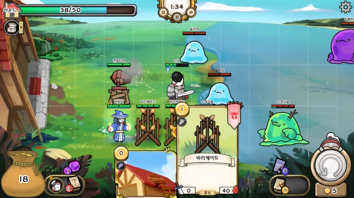 영웅을 고르고 영웅이 생산하는 특수 능력 카드와 방어 카드(바리케이트 대포 이런것 들)를 잘 활용해서 악마족이 3분동안 집을 부수는것을 막아야 합니다.