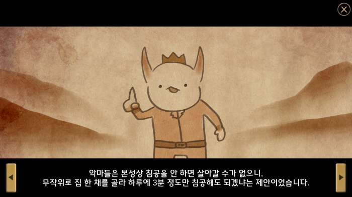 게임의 스토리는 악마족과 인간들이 수백년동안 전쟁을 치루다가 악마족이 집 한채를 하루에 3분만 침공한다는 조건으로 평화 조약을 맺고 왕국에는 평화가 찾아오게 됩니다.