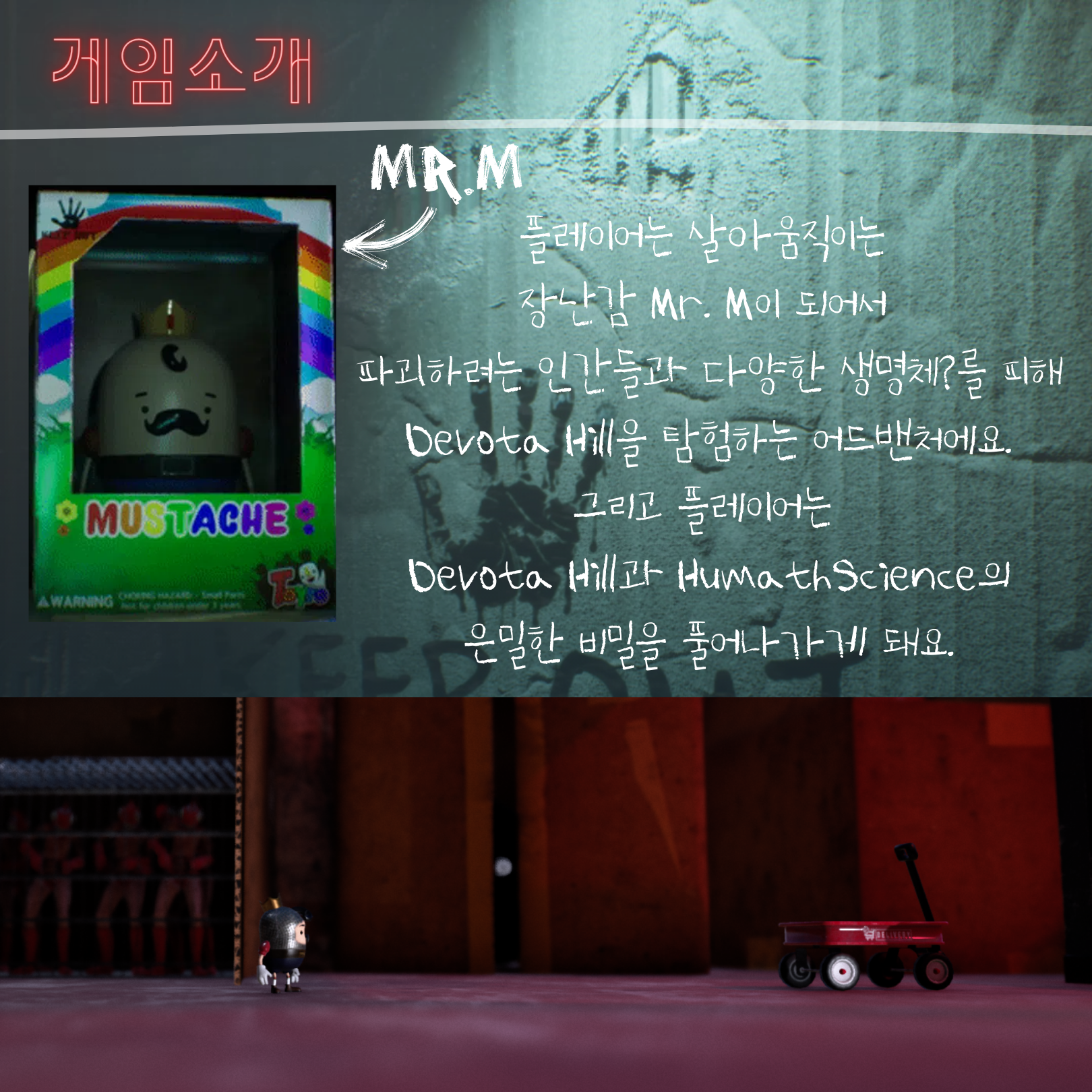 이 게임은 사물이 인공지능을 갖게해주는 RIOT(전설의 리그가 생각나는건 저뿐일까요?😉) 을 이식 받은 MR.M 씨가 RIOT 칩을 반대하고,