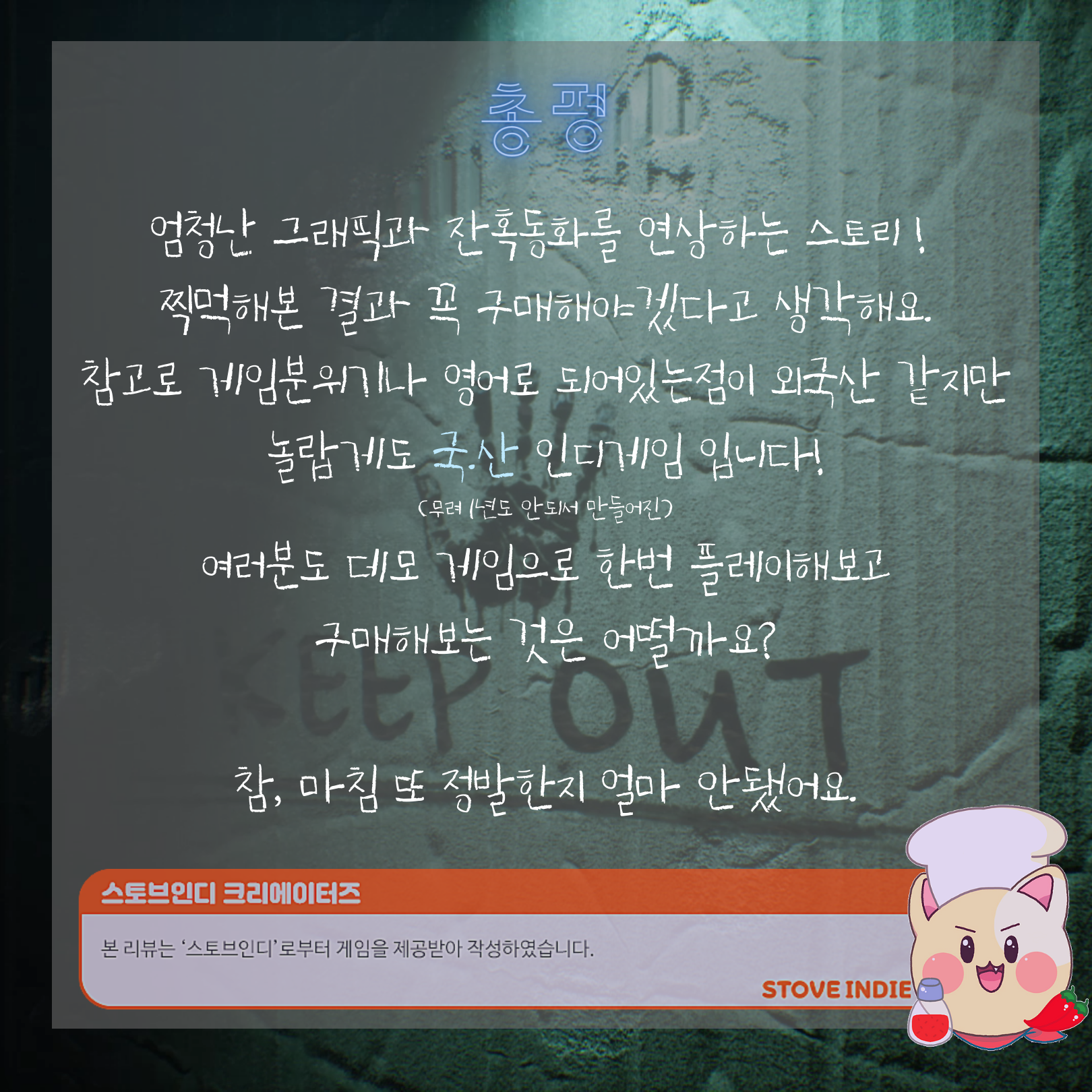 쿠킹 팀에서 <KEEP OUT>을 플레이해보고, 플레이 후기를 담은 리뷰 컨텐츠를 제작했는데요!