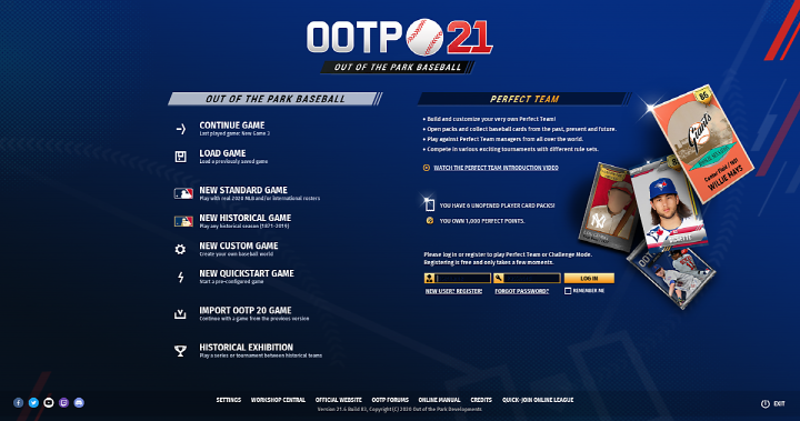 OOTP 21 메인 화면. 온통 영어뿐이다