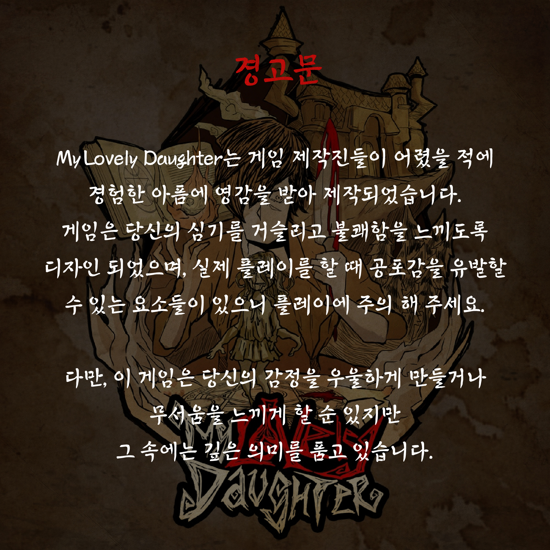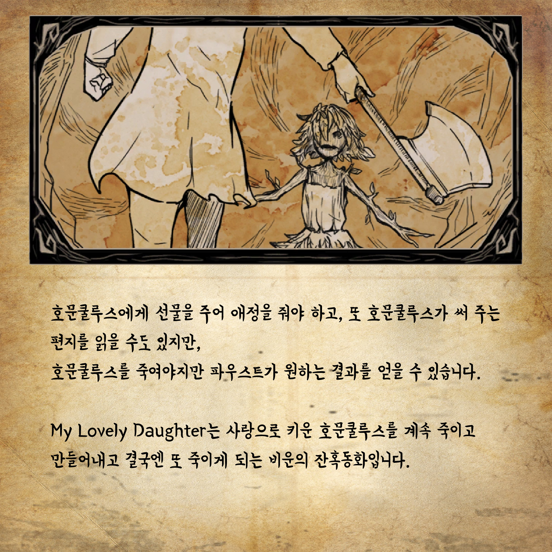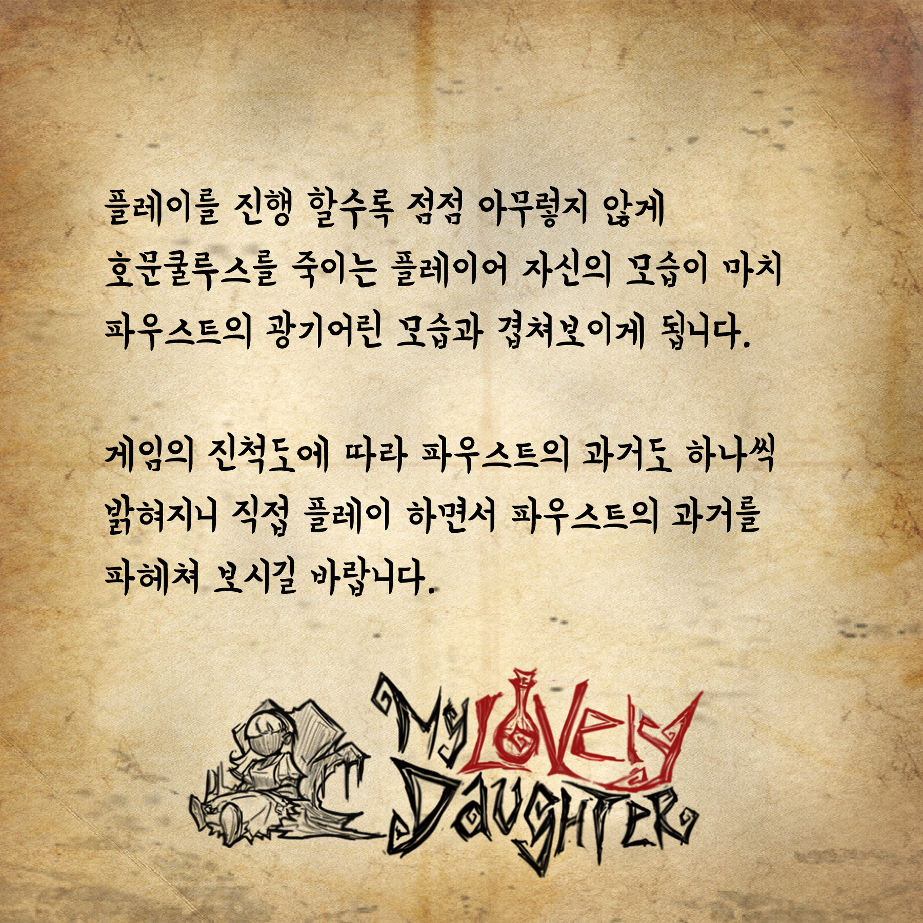 이번에 소개드릴 게임인 "마이 러블리 도터"는 사랑하는 딸을 되살리기 위해 호문쿨루스를 만들고 애정을 주고 결국엔 죽여야 하는 잔혹동화 같은 게임입니다.