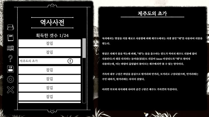 제주도 전통문화와 4.3 사건의 역사적 사실을 설명하는 ‘사전 시스템’은 여느 게임의 ‘로그 수집’ 시스템과 똑같다. 그러나 지극히 현실에 발붙이고 있는 이 게임에서 설명문 포맷의 텍스트는 갑자기 플레이어를 주인공이 아닌 관찰자로 분리하고, 현실로 급부상하게 만든다.