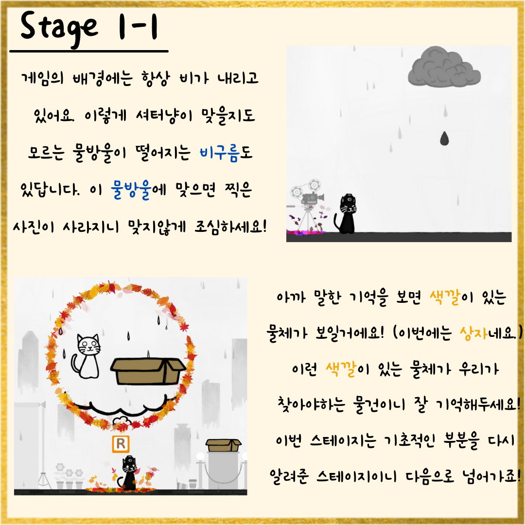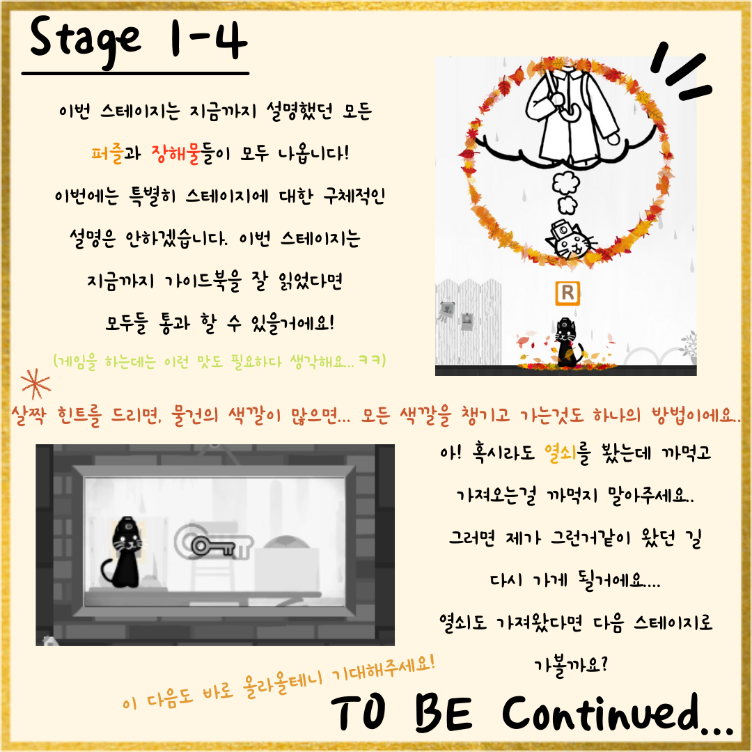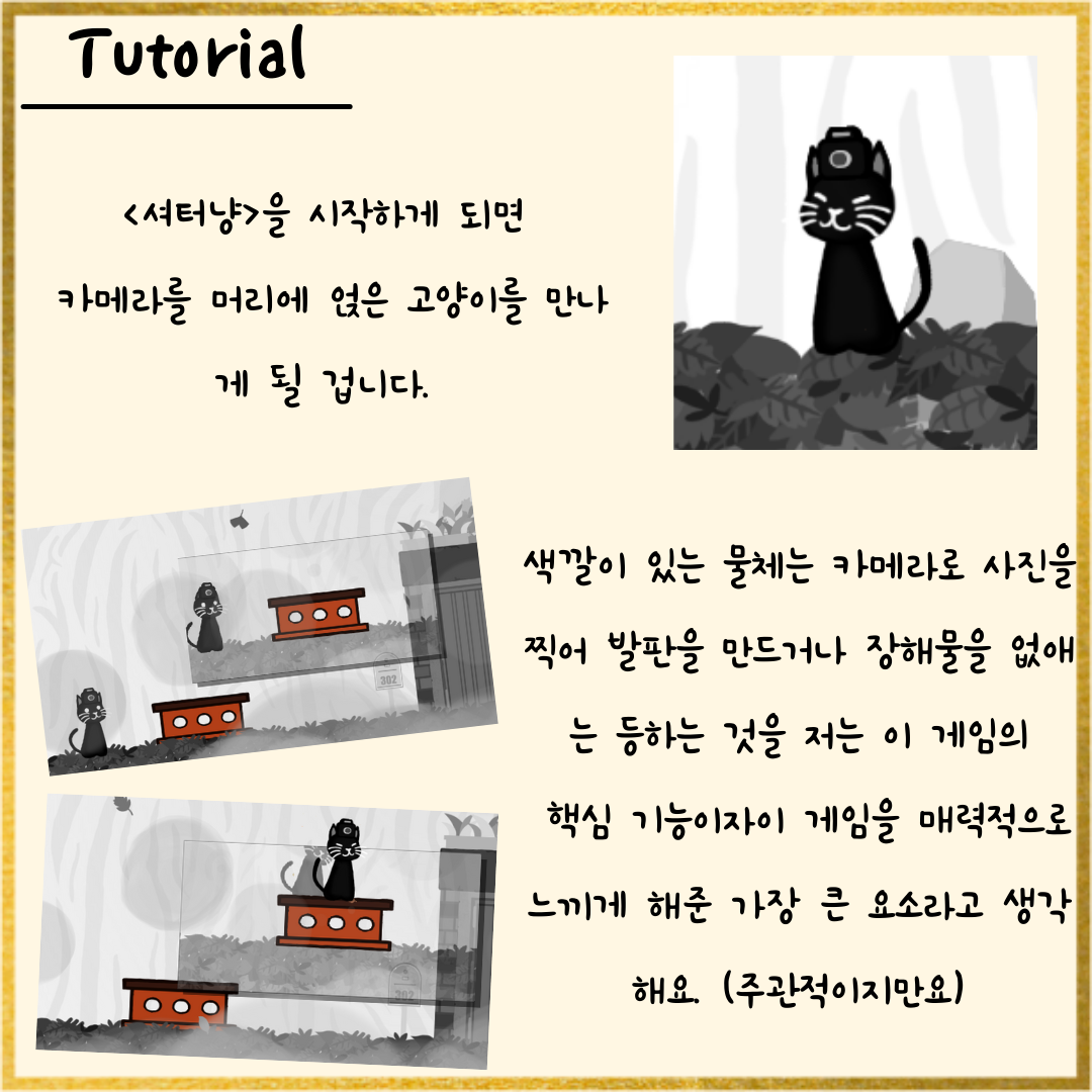 그래서! 쿠킹 팀에서 <셔터냥>을 플레이해보고,<셔터냥>을 조금 더 쉽고 재미있게 즐길 수 있는 가이드 북을 제작하였습니다! 👍👍