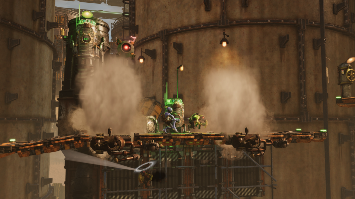조작감 또한 전작들과 비교했을 때, 물론 개선의 여지는 있겠지만, 훨씬 반응성이 좋아졌고, Soulstorm에서의 조작 자유도는 시리즈 작품 중 최고라 할 수 있습니다. 물론 개선해야 될 부분은 분명 있죠, 가령 선반을 만들어내는 능력이 All-or-none식으로 양단될 때나 플랫포밍할 때 기둥 사이를 넘나들 때 등. 하지만 Oddworld: New N’ Tasty에 비해 이 정도면 양호한 편이죠. 특히 2단 점프의 반응성이 좋은 편이라 장애물을 정확히 회피하고 치명적인 함정들로부터 살아남기 편합니다.