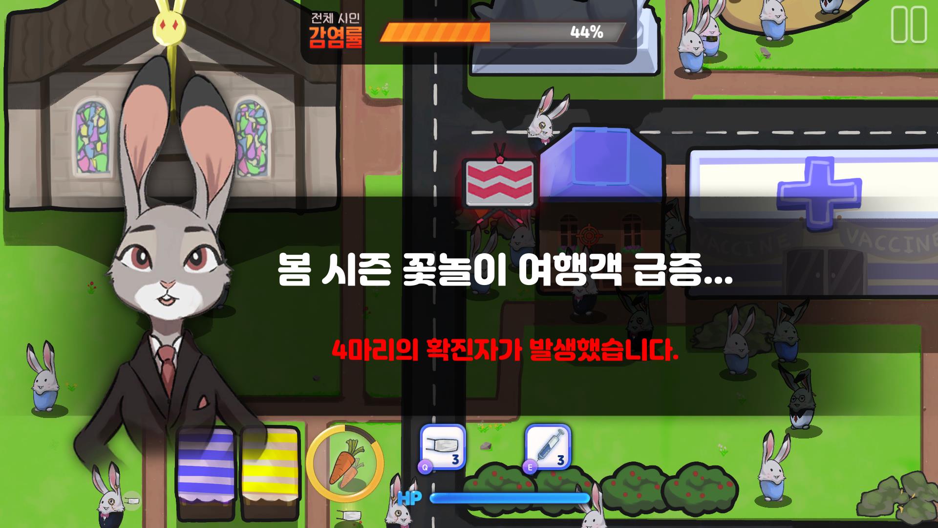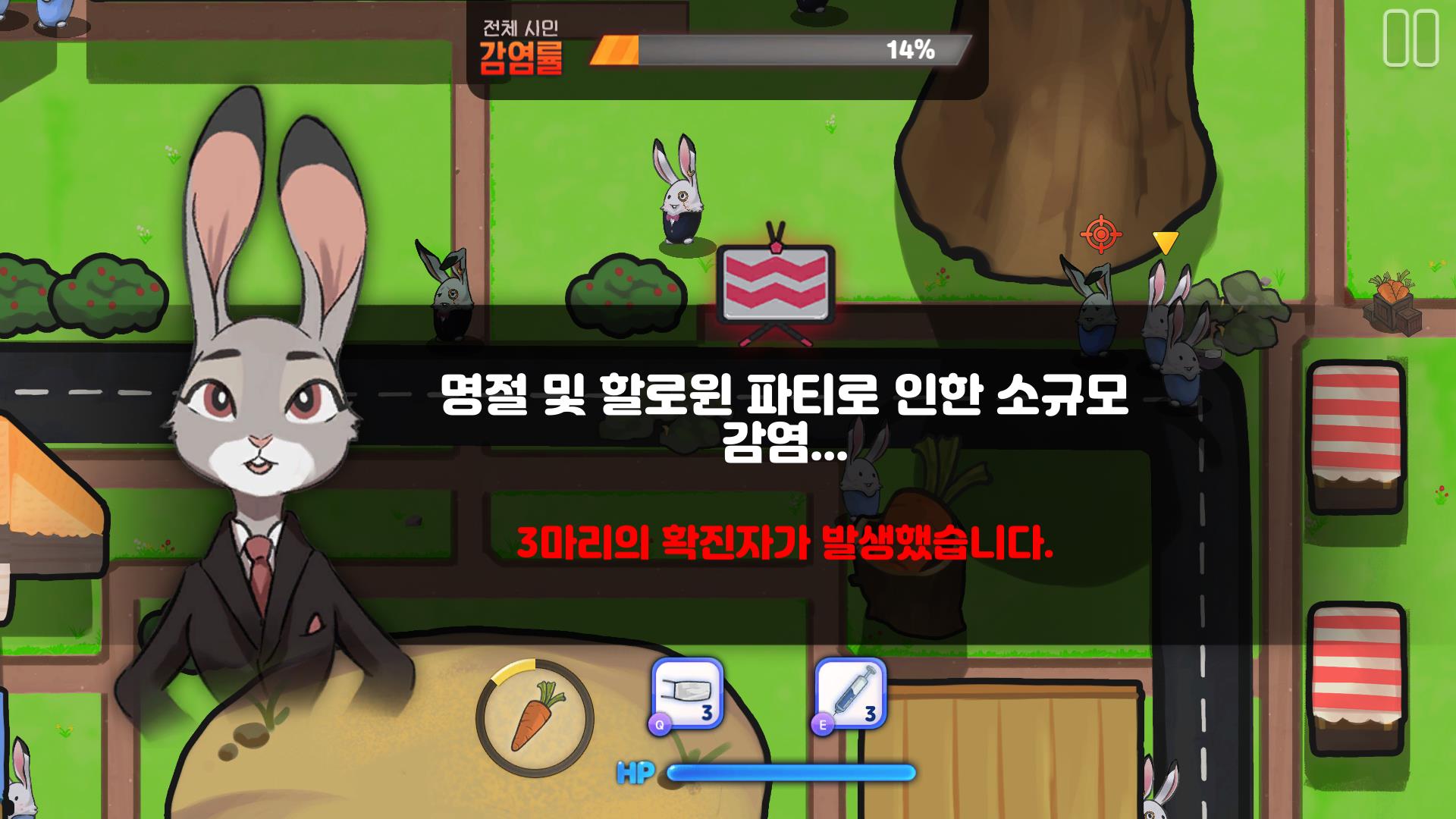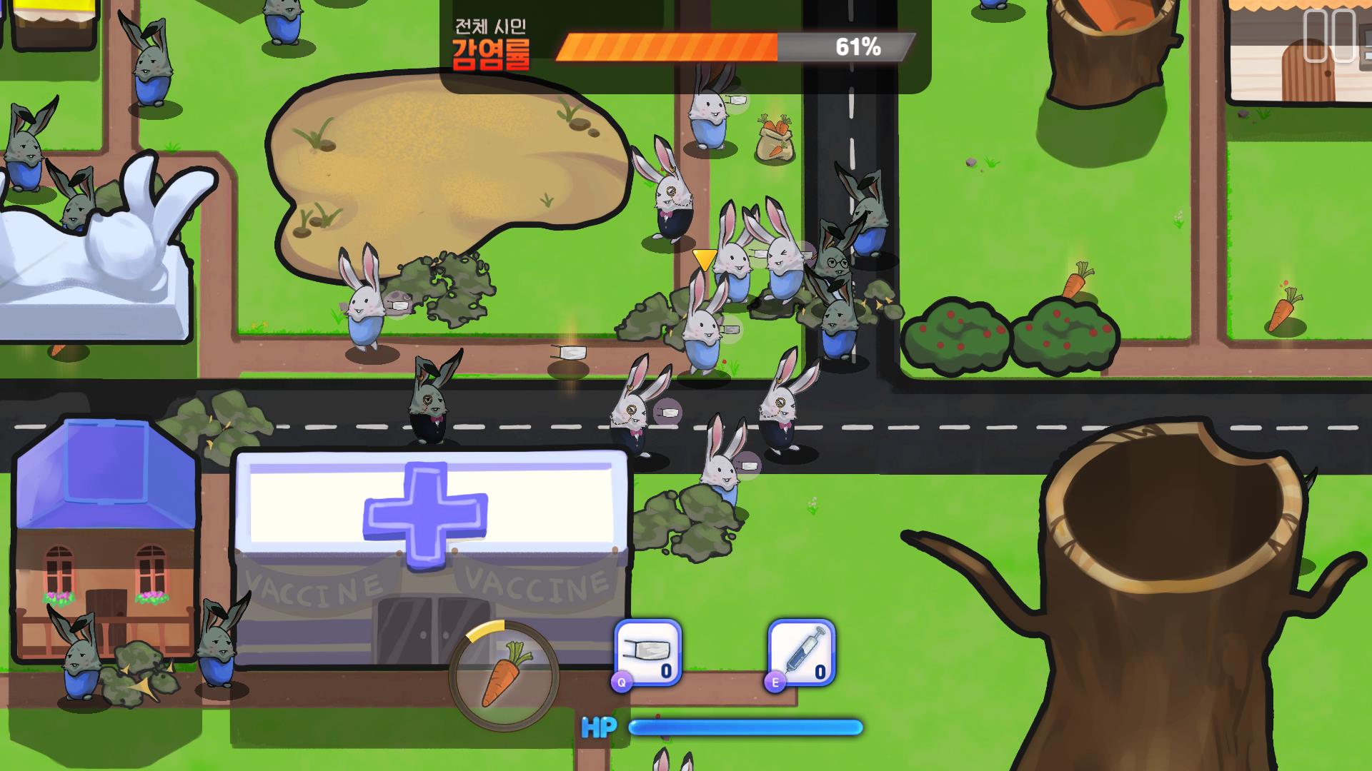 게임 진행 방식은 단순합니다. 당근을 모아서 토끼의 능력을 올리고, 마스크로 토끼들이 코로나에 걸리지 않게 하고, 코로나에 걸린 토끼는 백신으로 치료하는 것입니다.