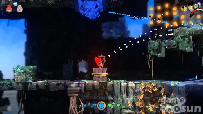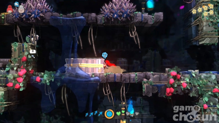문제는 이리저리 뛰어다니는 소녀와 달리 할머니는 연로함을 반영해 액션에 제한이 있다는 점이다. 소녀가 가볍게 내려오는 높이를 할머니는 발판을 딛고 내려와야 하고 속도도 느려 소녀에겐 문제 되지 않는 구간이 할머니에겐 함정이 될 수도 있다.
