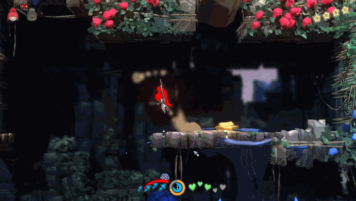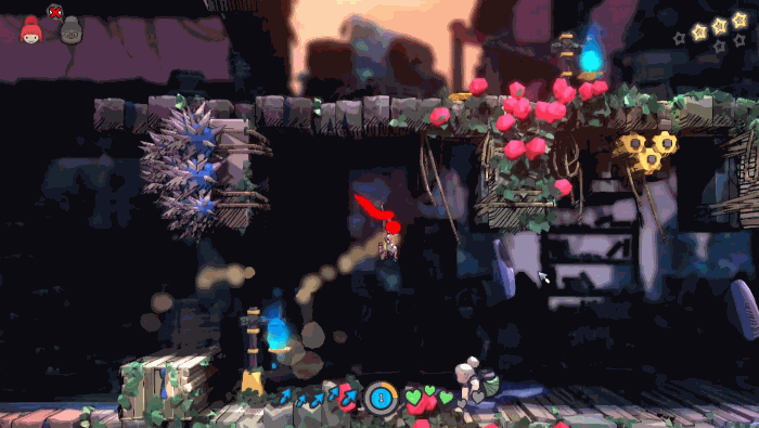 소녀가 체력이 다 되면 게임오버되듯이 할머니한테도 별도의 체력이 있기 때문에 전투에 휘말거나 먼저 앞서나가 길을 뚫을 때 따라오다가 함정에 빠지지 않게 잠시 가만히 있게 하는 식으로 할머니의 체력까지 관리해 줘야 한다.
