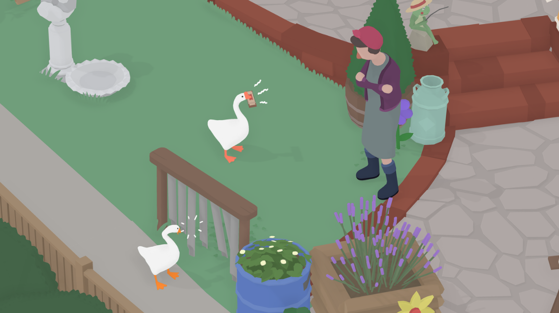 제목 없는 거위 게임은 많은 부분에서 진짜 잠입 게임 같은 느낌이다. 아무리 못된 거위일지라도, 밖으로 뛰쳐나가서 대혼란을 일으킬 때를 기약하며 덤불이나 상자 속에 몰래 숨어야 하는 법이다. 히트맨이나 메탈 기어 솔리드와 비교해도 무리가 아니다. 단지 그런 류의 게임에서 나오는 잔인한 살인을, 거위가 저지르는 못된 장난으로 대체한 느낌이다. 필요한 아이템을 들고 무방비하게 서 있는 사람 뒤로 살금살금 다가가거나 전략적으로 배치된 무전기와 꽥꽥대는 목청을 사용해서 사람들을 유인하면서, 나는 연신 웃음을 터뜨릴 수밖에 없었다.