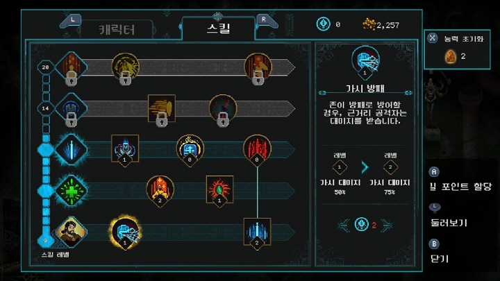 스킬트리 시스템도 없습니다. 캐릭터들의 액티브 스킬은 처음부터 모두 사용 가능합니다. 패시브 스킬이 없어진 대신, 매 라운드를 진행할 때마다 제시되는 3개의 랜덤한 업그레이드 중 하나를 고르게 됩니다. 이러한 진행방식이 슈퍼자이언트 게임즈의 <하데스>와 닮아 일부에서는 ‘<하데스> 모드’로 부르고 있습니다.