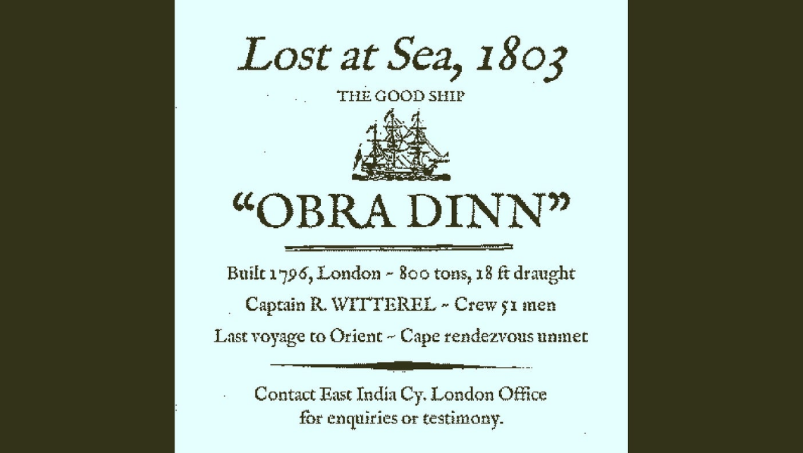 이 이야기는 아주 능숙하게도 어드벤처 게임, 퍼즐, 그리고 모비 딕을 연상케 하는 테마의 "게스 후" 게임의 끔찍한 버전 사이를 쉴새없이 넘나든다. 본질적으로는 탐정 게임이지만, 당신은 정의를 구현하거나 복수를 위한 미션을 수행하기 위해 사건을 해결하는 것이 아니다. 당신은 그저 보험 회사 직원이며, 4년 동안 행방불명되어 있다 갑자기 해상에 다시 나타난 오브라 딘 호라 불리는 무역선의 보험금을 산정하기 위해 파견되었을 뿐이다.