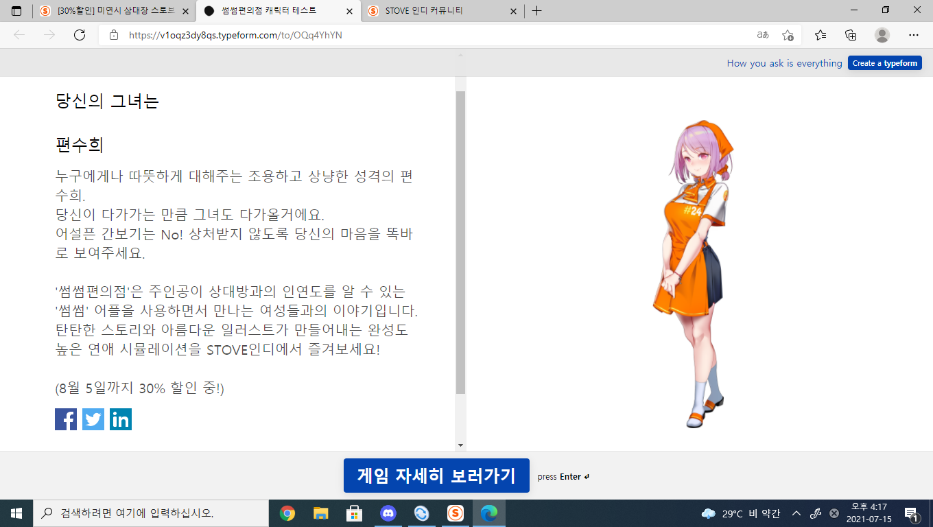 썸썸편의점을 처음 트위치에서 보고 다른 캐릭터 들의 이야기가 궁금해 지는 재미있는 게임 입니다.