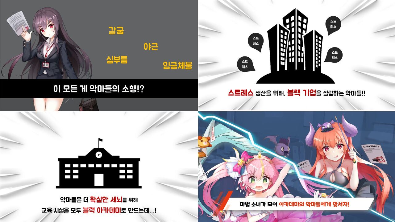 아직 데모버전이고 아직 많은 것이 완성되어 있지는 않지만 마법소녀가 블랙 기업(뒤에서 조종하는 악마들)과 싸운다는 콘셉트가 특이해서 소개해 봅니다.