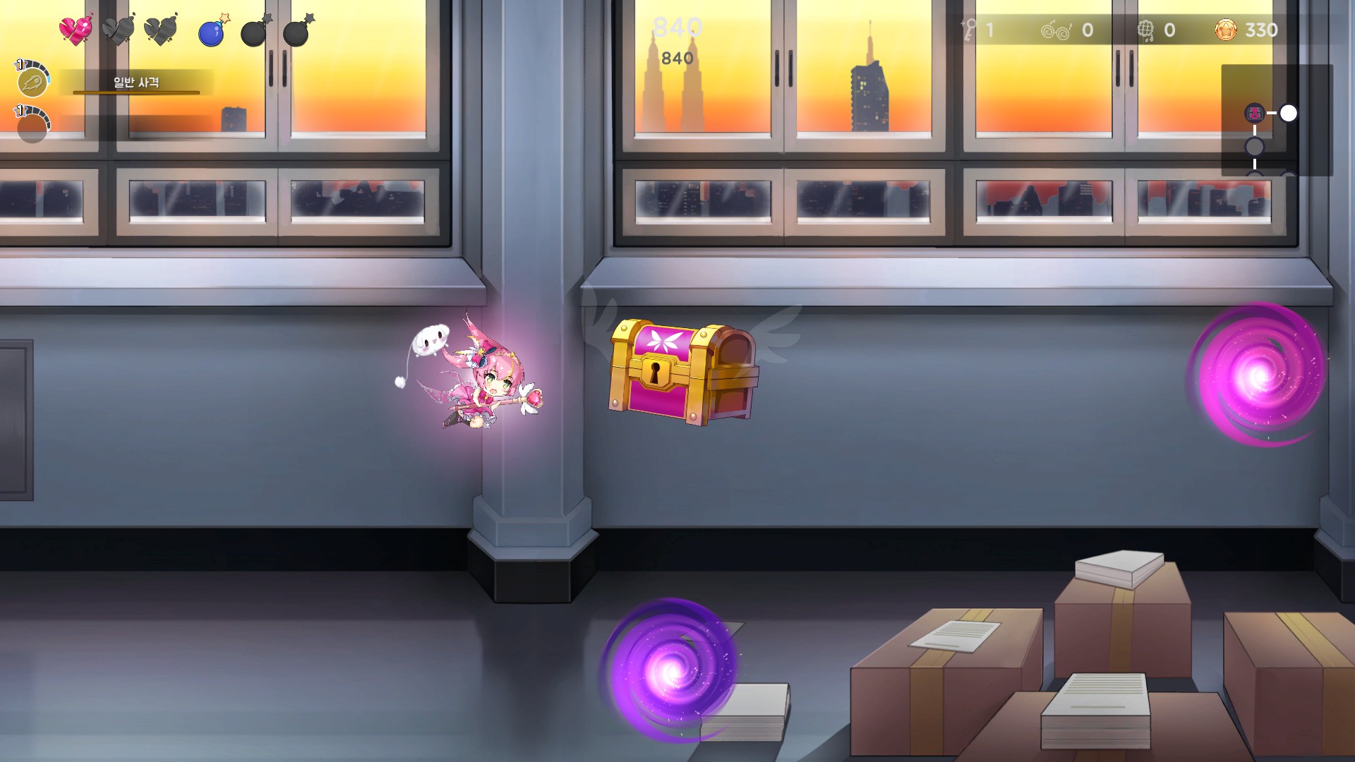 게임은 슈팅 게임인데 로그라이크 방식이 일부 들어가서 중간 중간에 길을 선택하고 열쇠를 모아서 상자를 열고 새로운 능력을 추가하게 됩니다.
