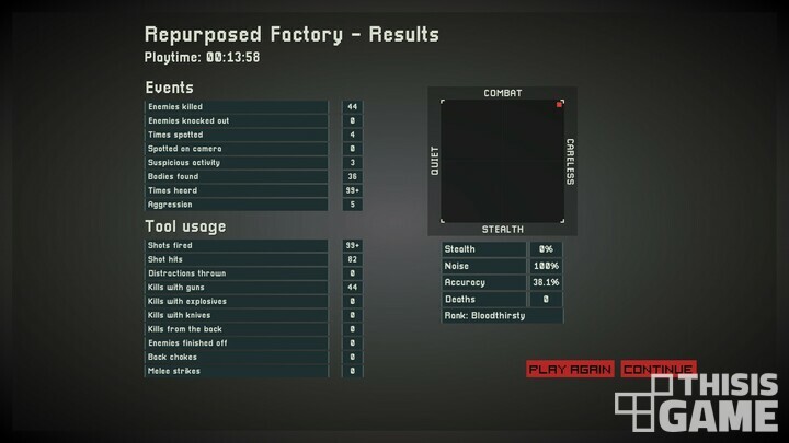 물론 1인 개발인 만큼 가끔은 우회로를 통해 너무나 쉽게 목표를 완수할 수 있다거나, 반대로 몇몇 구간은 은신 상태로 지나가기가 꽤 어려운 등 레벨 디자인이 완벽하다고 이야기하기는 힘들다. 가끔은 시야 저 멀리 있는 적이 갑작스레 주인공을 인지하는 등 부분부분 불편한 부분도 있다.