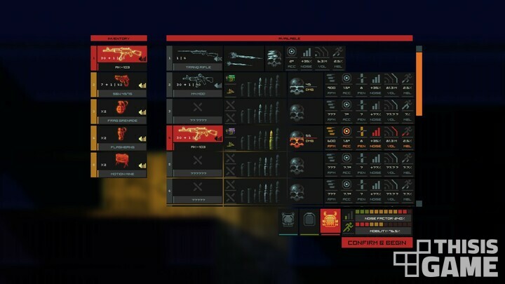 스테이지를 시작할 때는 장비를 선택할 수 있는데, 착용한 장비에 따라 페널티를 받으므로 어떻게 스테이지를 공략할 것이냐에 따라 올바른 장비를 선택하는 것이 중요하다. 가령 무거운 장비를 많이 들고 다닌다면 걸을 때마다 나는 소음이 크고 이동 속도가 느려진다. 대신 방탄복도 가벼운 것을 입고, 권총 하나 들고 돌입할 경우엔 이동 속도도 빠르고 소음도 적다.