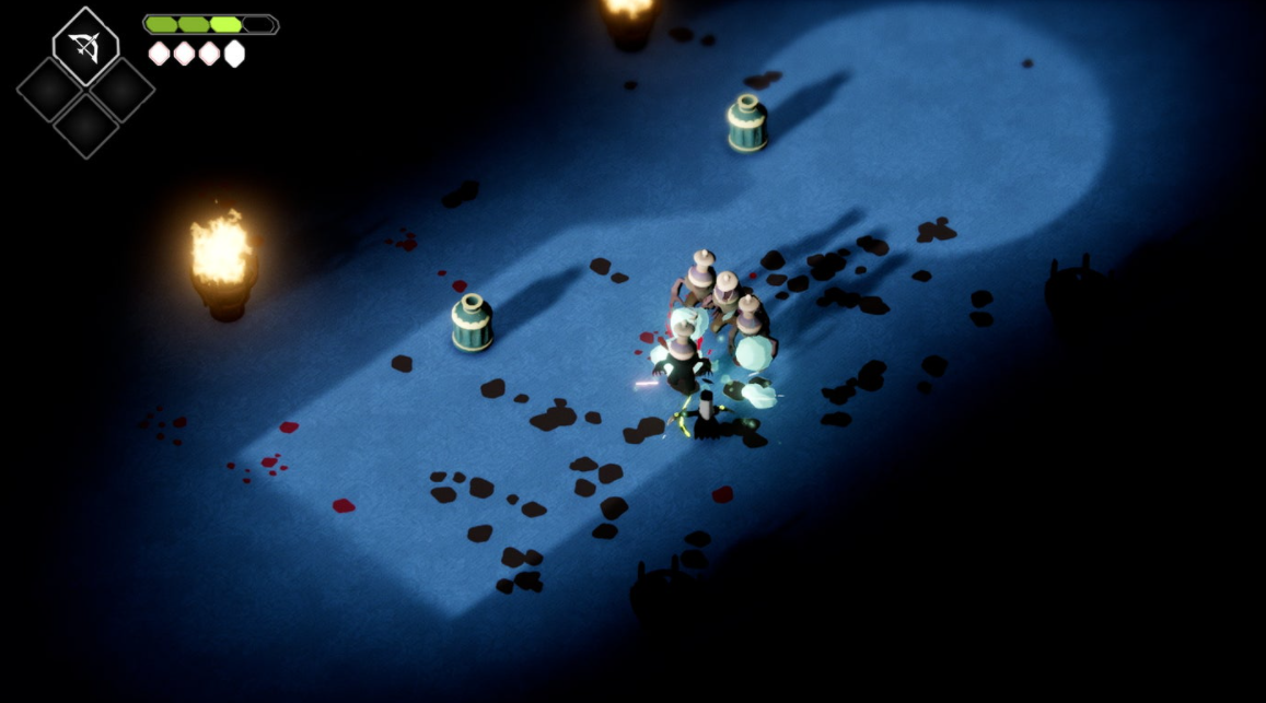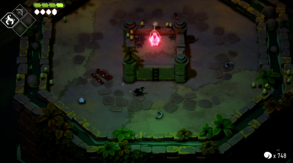 던전을 헤쳐나간다는 측면에서, Acid Nerve 개발사는 데스 도어에서 아주 즐거운 성장 시스템을 구현해놓았다. 내가 탐사한 세 가지 주요 지역들은 비슷한 리듬으로 흘러갔다: 아주 넓고 탁 트인 도입 구역에서부터 시작하여 퍼즐이 난무하는 비좁은 던전의 형태로. 잃은, 잊힌 영혼들을 던전에서 찾아내면 중요한 마법 업그레이드를 얻게 되는데, 이는 젤다의 던전 시스템과 매우 유사하다. 이 마법 능력들은 물론 한정적이고, 진가를 발휘하기 위해선 꽤 많은 적들을 쓰러뜨려야 할 것이다.