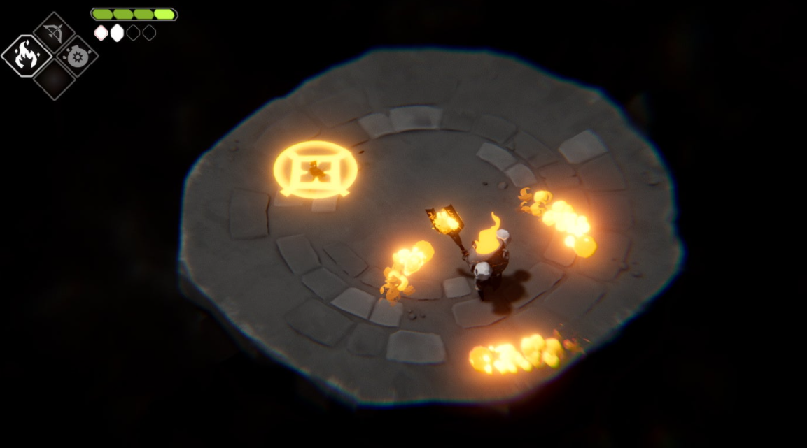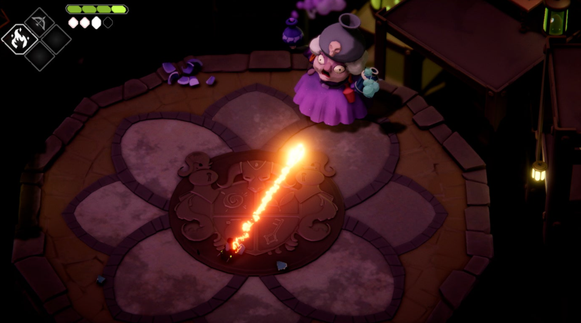 이러한 전투에 첨가된 것은 각 던전에서 해금할 수 있는 몇 개의 마법 능력이며, ‘젤다의 전설: 야생의 숨결’처럼, 이런 능력들은 전투 능력과 퍼즐 풀기 능력을 함께 보유하고 있다. 몇몇 단계는 그다지 어렵지 않았기에 이런 능력들을 동시에 사용하지 않았지만, 그래도 가끔 내가 얼마나 빨리 플랫폼을 작동시킴과 동시에 공격을 퍼붓는 궁수들을 격추시킬 수 있는지 시험해보기도 했다. 데스 도어는 아주 간단하면서도 효과적인 접근을 통해 이런 무기들의 적용 범위를 매우 한정적으로 만들었지만, 한 번 사용한 마법을 재충전하는 것은 그저 근처의 적을 하나 쓰러뜨리거나 기물을 파괴하면 될 정도로 간단한 편이었다. 즉 치트키처럼 마법 활로 모든 적을 처치할 수는 없게 만들어놨지만, 근접 공격 사이사이에 타이밍을 잘 맞추면 퀵샷을 우겨넣는 정도는 가능했다. 특히 재미있었던 건 화염 주문의 능력으로, 적 다수를 향해 관통탄을 발사할 수 있었고, 나중에 미니 보스를 처치하자 업그레이드 보상으로 도트 피해까지 획득할 수 있었다.