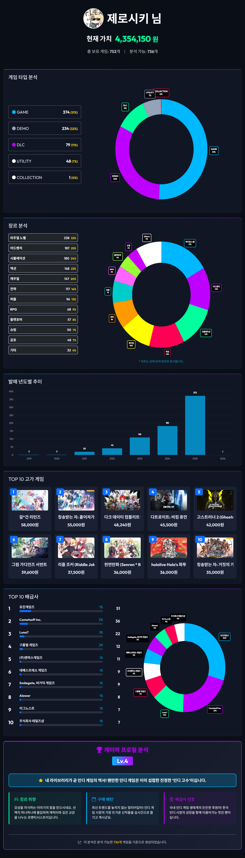 As expected, the proportion of visual novel games is the highest. But why is the count so high for Eugene Games games?