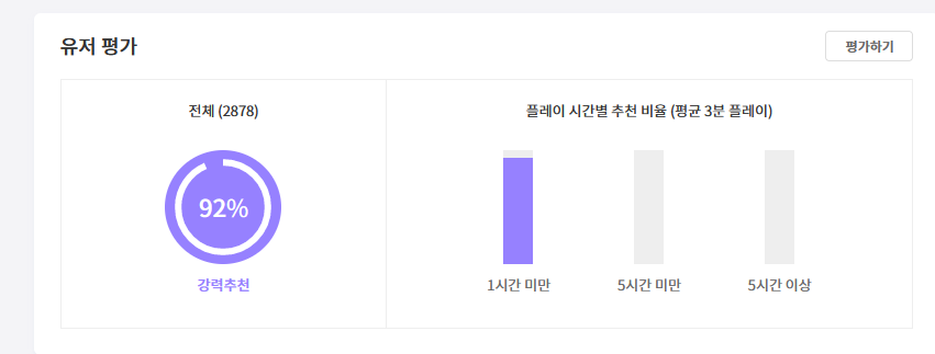 플레이 시간별 추천 비율 1시간 미만 (평균3분 플레이)가 이 게임의 정체성을 말해주는 것 같습니다 (ㄹㅇㅋㅋ)