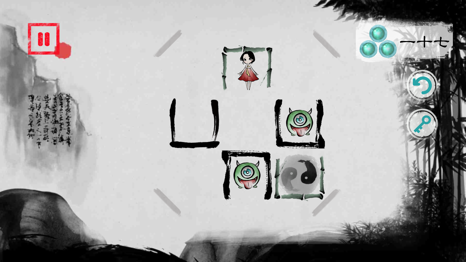 퍼즐같이 옮겨 담으면서 주인공이 요괴와 겹치지 않게 태극무늬 방으로 이동하는 게임입니다