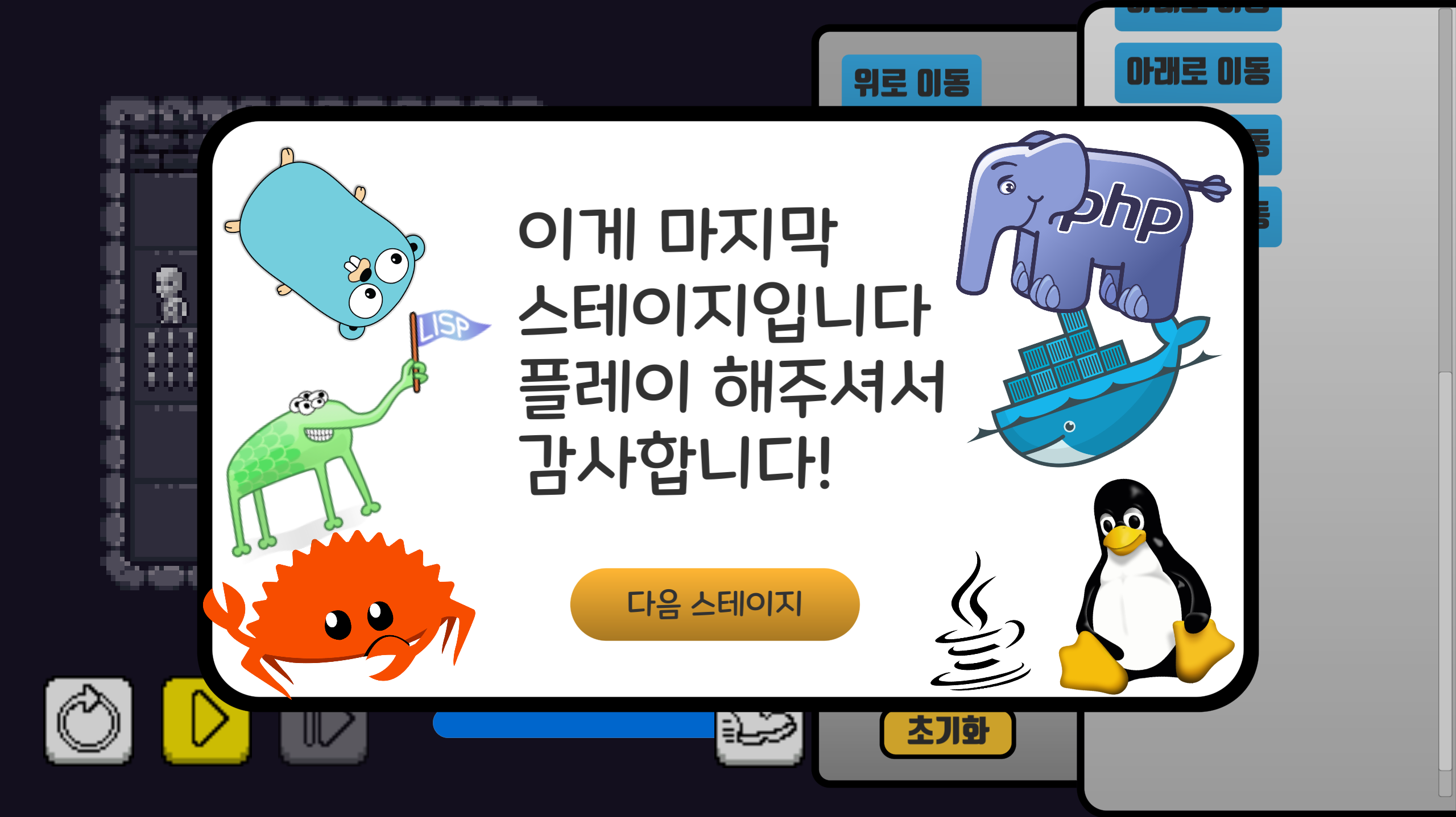 그리고 다하고 끄려니까 그냥 다음스테이지 버튼만 계속 출력되고 눌러도 다른 메세지뜨고 그거 또누르면 다음스테이지 떠서