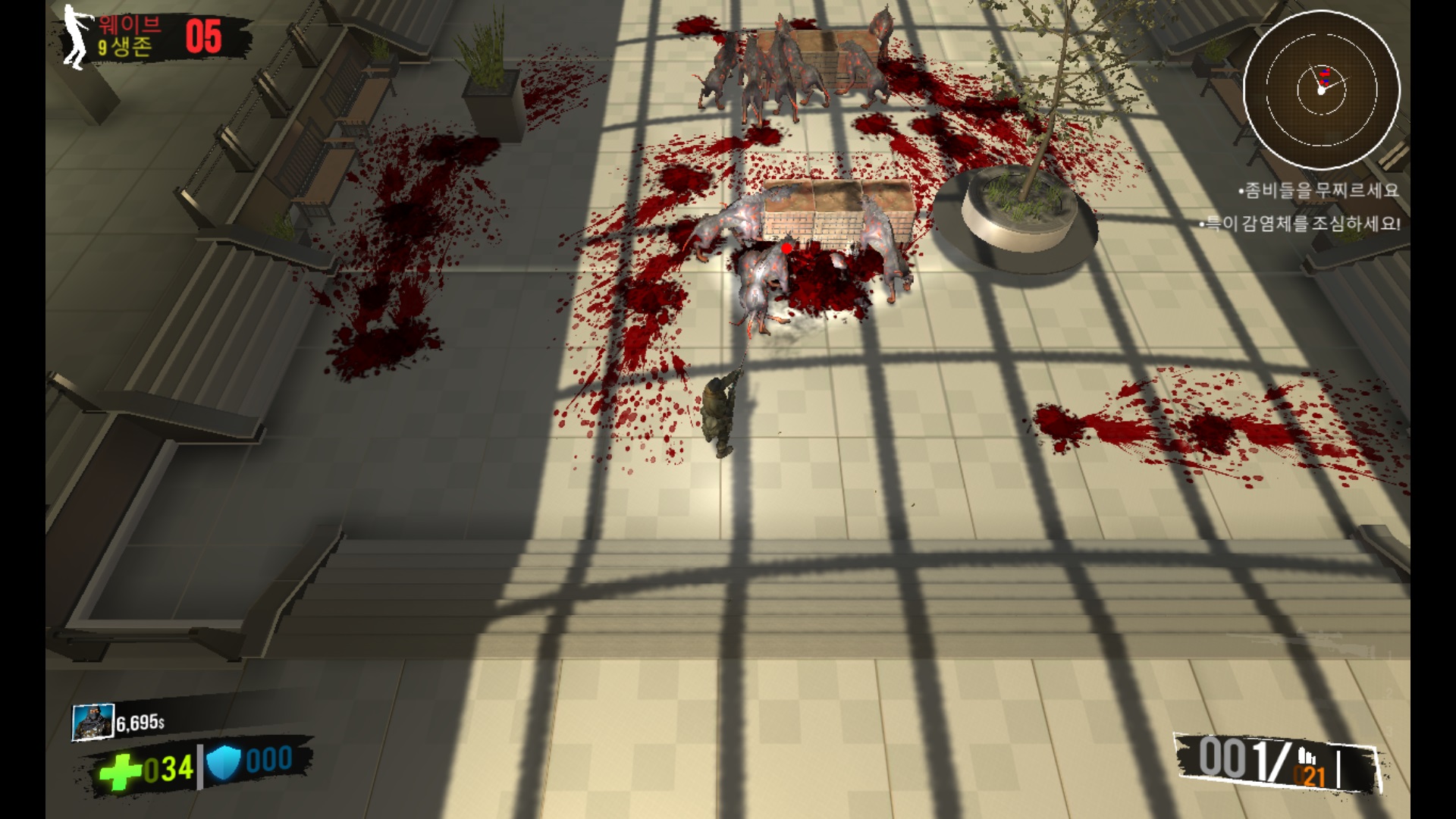 좀비가 플레이어와 직선상의 바리케이트에 더 먼저 어그로가 끌리고 이 어그로가 풀리지 않아 이를 이용하면 위의 사진과 같이 바리케이트를 4방향으로 설치하지 않아도 수월한 생존이 가능합니다.