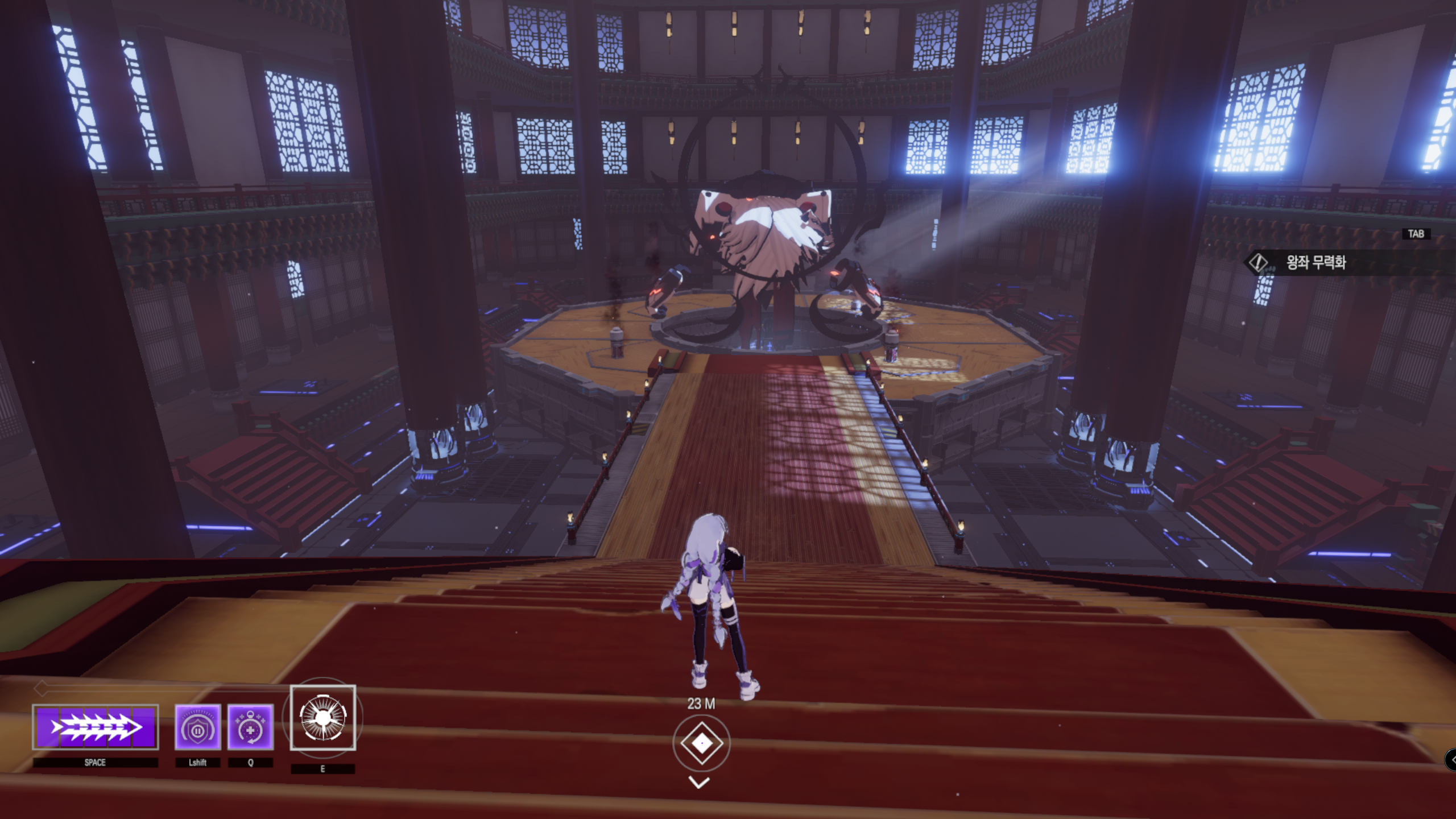 70프로 미만으로 떨어지면 미사일이랑 레이저 차원공? 날리는 패턴이 나오는데 눈으로 피하면 됩니다 미사일 경우 shift 사용으로 피하기가 가능합니다 레이저는 스페이스바를 쭉 눌러서 피하기보다 가까이 오면 한번씩 써주면서 뱅뱅 돌면 됩니다 패턴 다 피하면 보스가 가만히 있는데 그 때를 이용하여 손쪽으로 다가가 손등을 치면 피가 답니다 피가 20프로쯤 오면 보스 주변으로 4개의 보라색 봉이 생기는데 한대씩 쳐주면 보스가 죽습니다. (스페이스바 쭉누르면 순식간에 이동합니다)