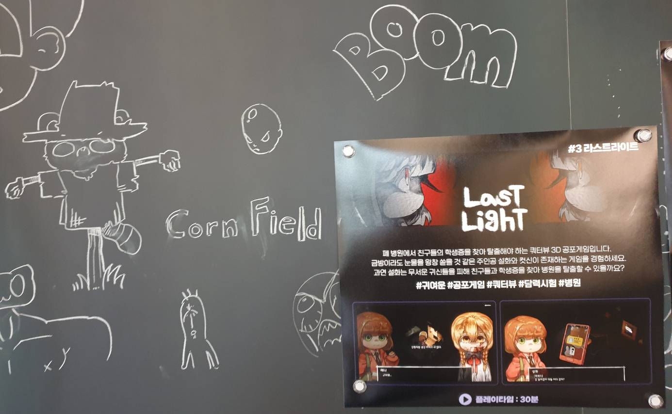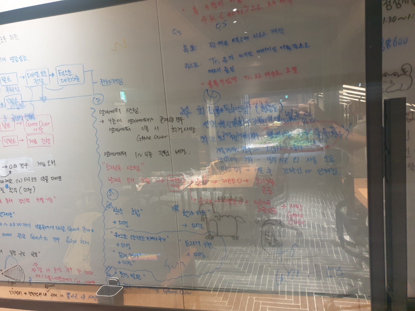 한쪽 벽을 꽉 채운 보드로 컨셉이나 게임의 플로우 차트등을 작성하여 한눈에 볼 수 있어 좋은 것 같습니다.