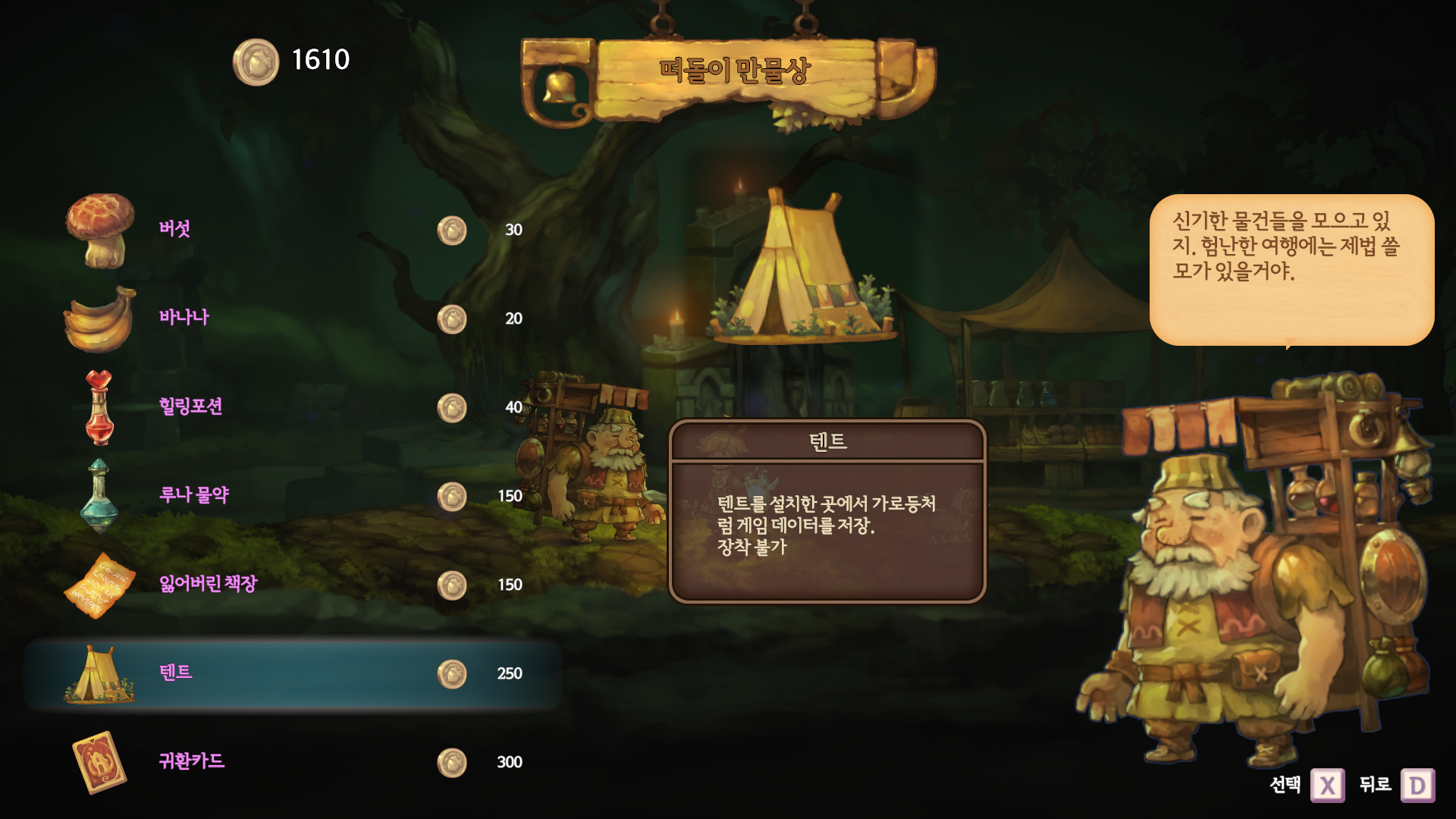 마지막으로 귀환 아이템에 해당하는 귀환 카드는 마을에서 팔거나 또는 만물상이 있는 곳에 빠른 이동 포인트를 만들어 주었으면 합니다. 떠돌이 만물상에서만 살수 있는데 가격도 비싸고, 만물상까지 가는 게 너무 힘들어 쓰기도 너무 어렵습니다.