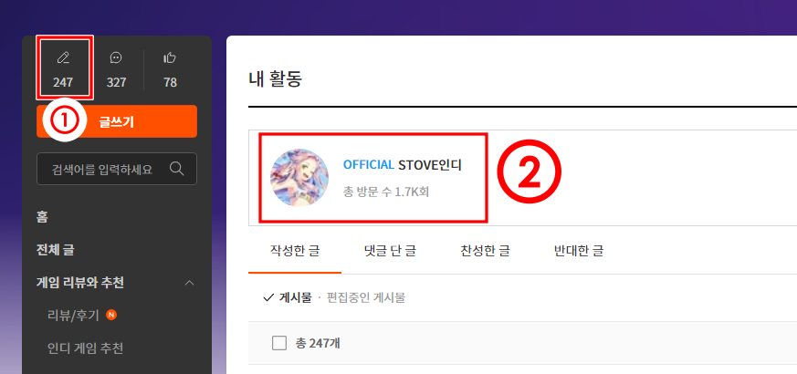 1. 로그인 후 좌측 상단의 내 글 버튼 클릭!
