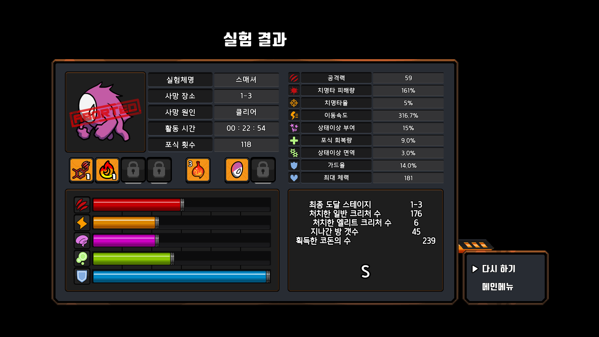 컨셉에 맞게 시체를 먹어서 회복, 특성 획득, 진화
