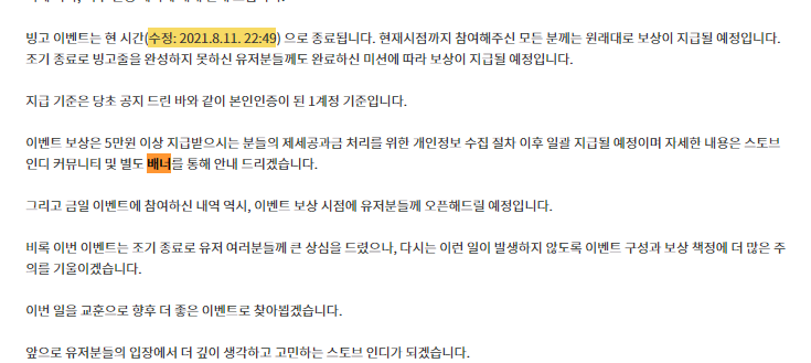 아니... 이벤트 참여한 사람들 보상 받게 문자나 스토브 알림 정도는 줄 수 있는거 아닌가...