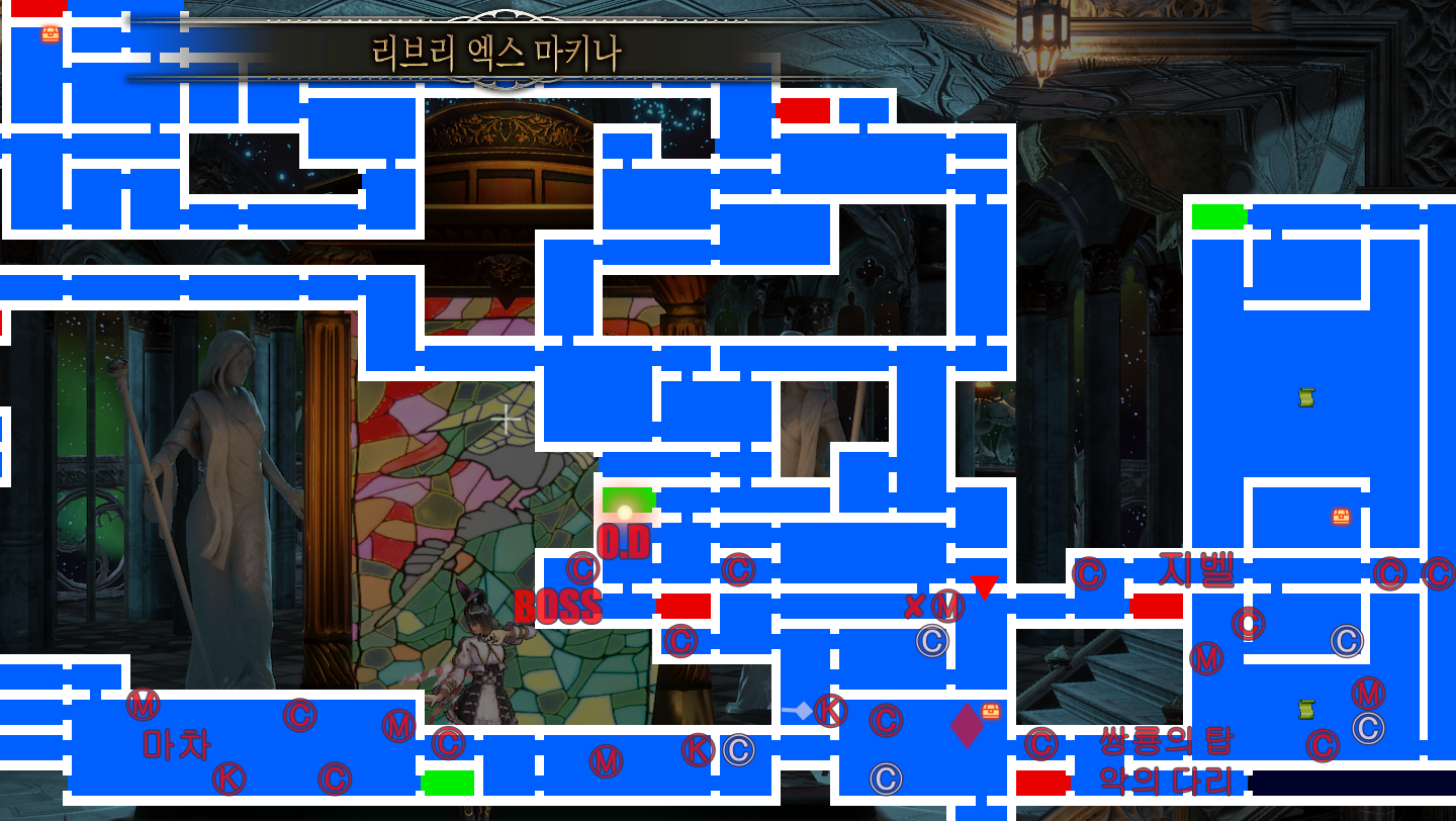 <C= 보물상자, M= MAX UP, K= 제작법, X = 파괴 가능한 벽>