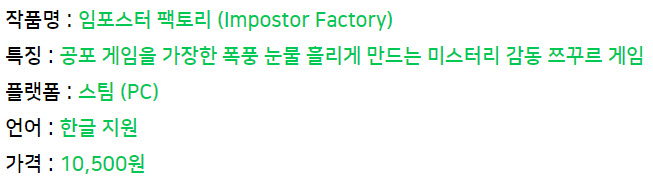 공포 게임인 척 하고 있지만, 누구도 예상하지 못 한 큰 감동과 깊은 여운을 주는 힐링 게임, '임포스터 팩토리'.