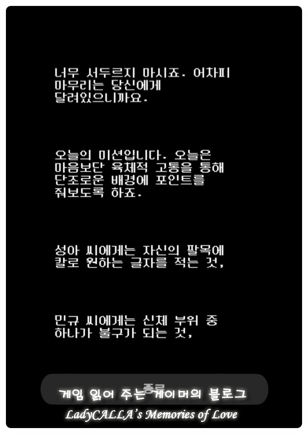 그렇게 1회차에 진 엔딩을 보았지만 나머지 엔딩들이 궁금해서 다시 재플레이를 하는 동안, 이 끔찍한 10일을 다시 반복해야 한다는 생각에 심리적으로 좀 힘들기도 했다.