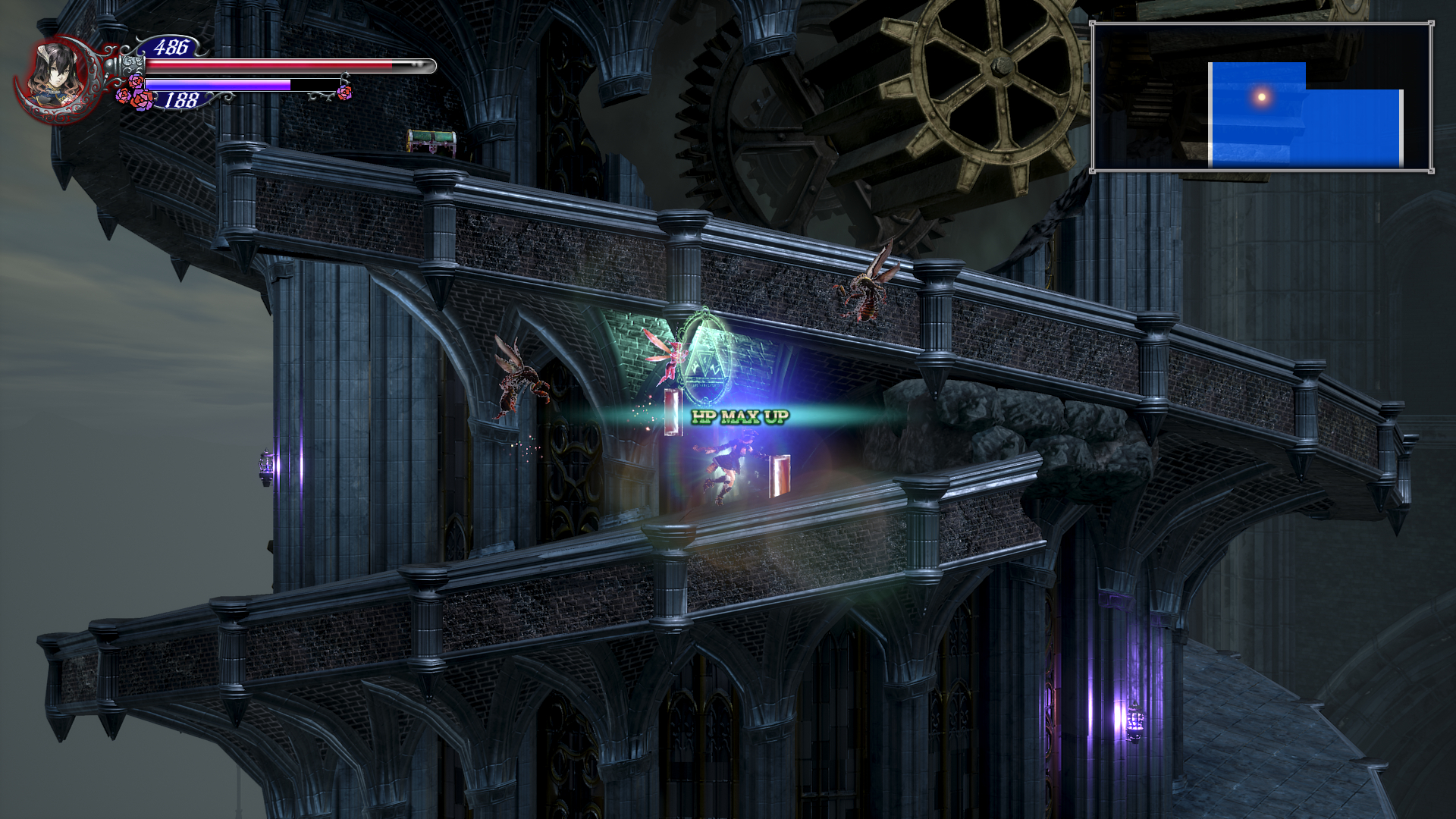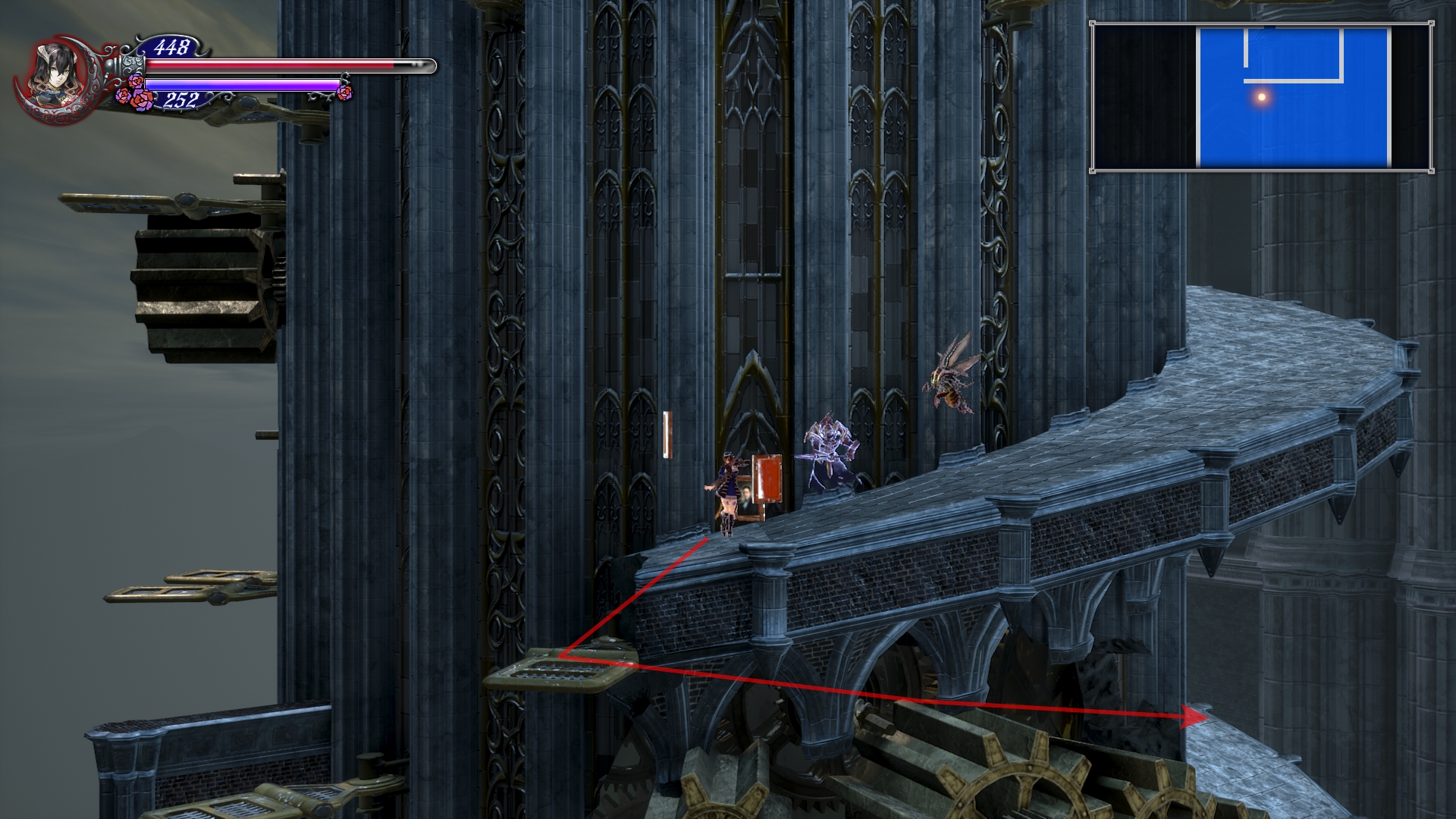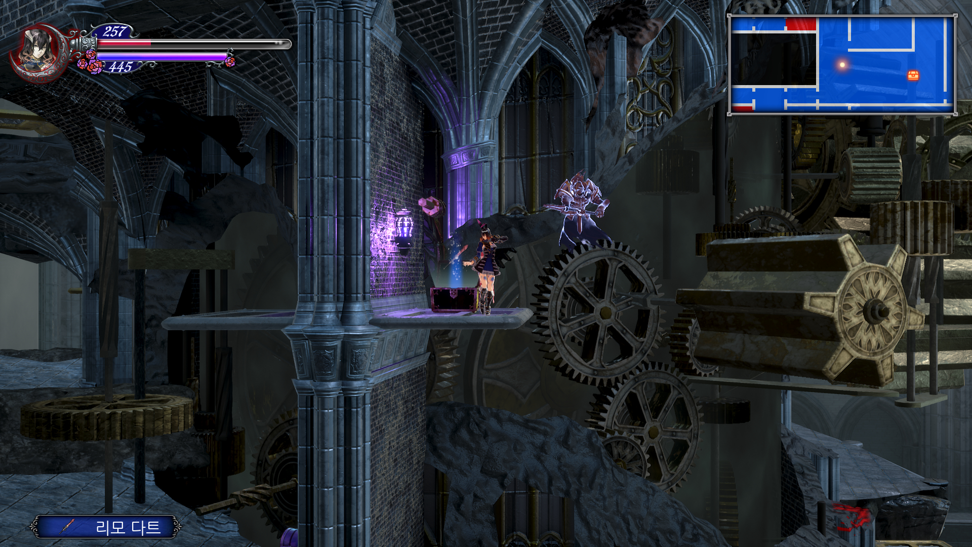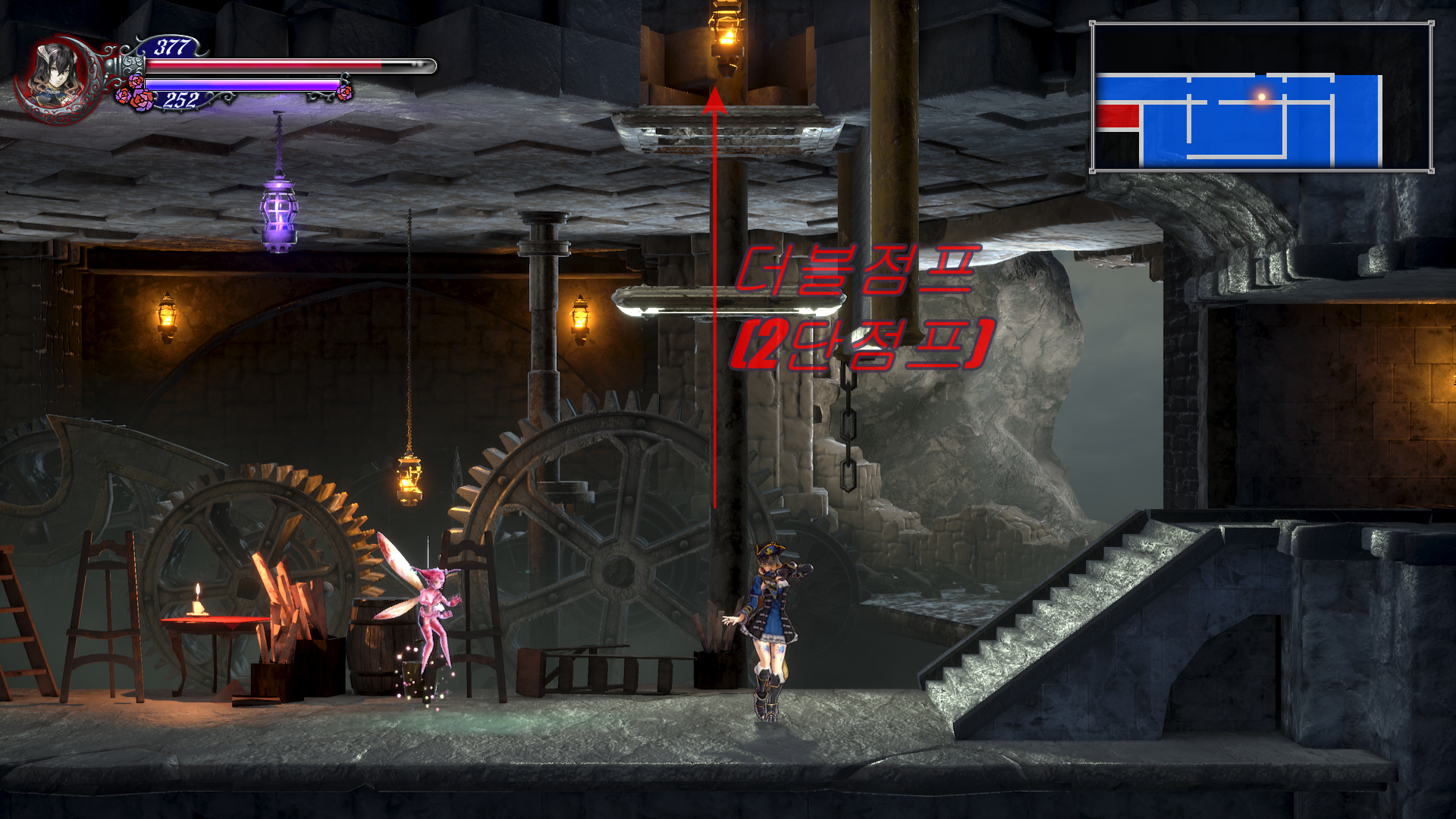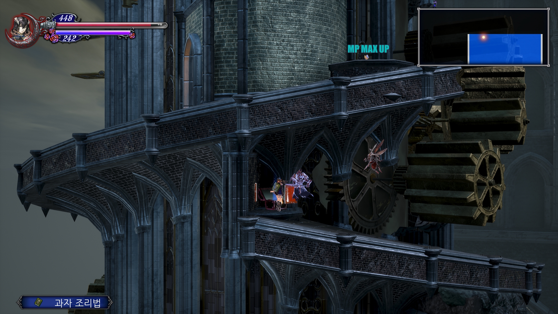 이제 더블 점프로 쌍룡의 탑을 게속 올라갈 수 있는데 여기서 칼 하나 얻고 가도록 합시다. 건물 안으로 들어가기 직전에 반대 편에 있는 톱니 바퀴를 타고 올라갑니다. 여기서 두번째 톱니 에서 위로 올라가면 HPMAX UP을 아래로 내려가면 칼을 얻을 수 있는데 여길 지나가려면 더블 점프가 필요 합니다.