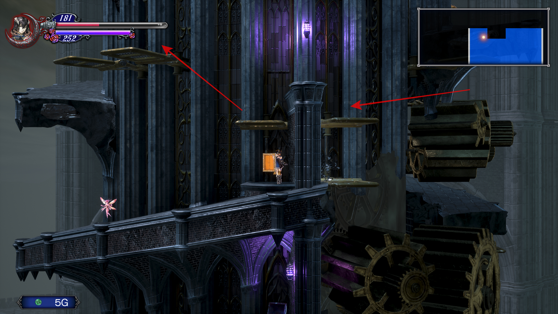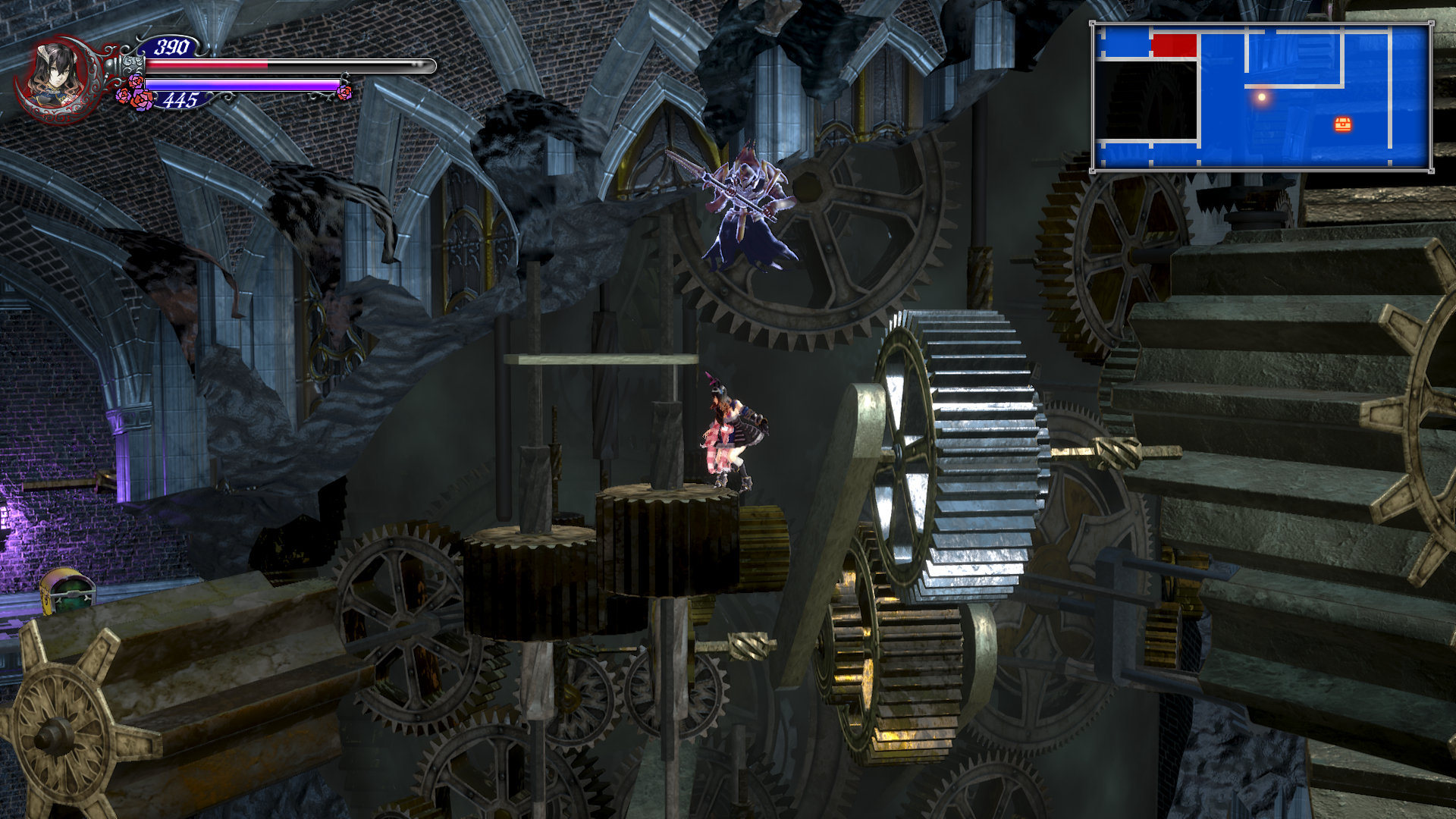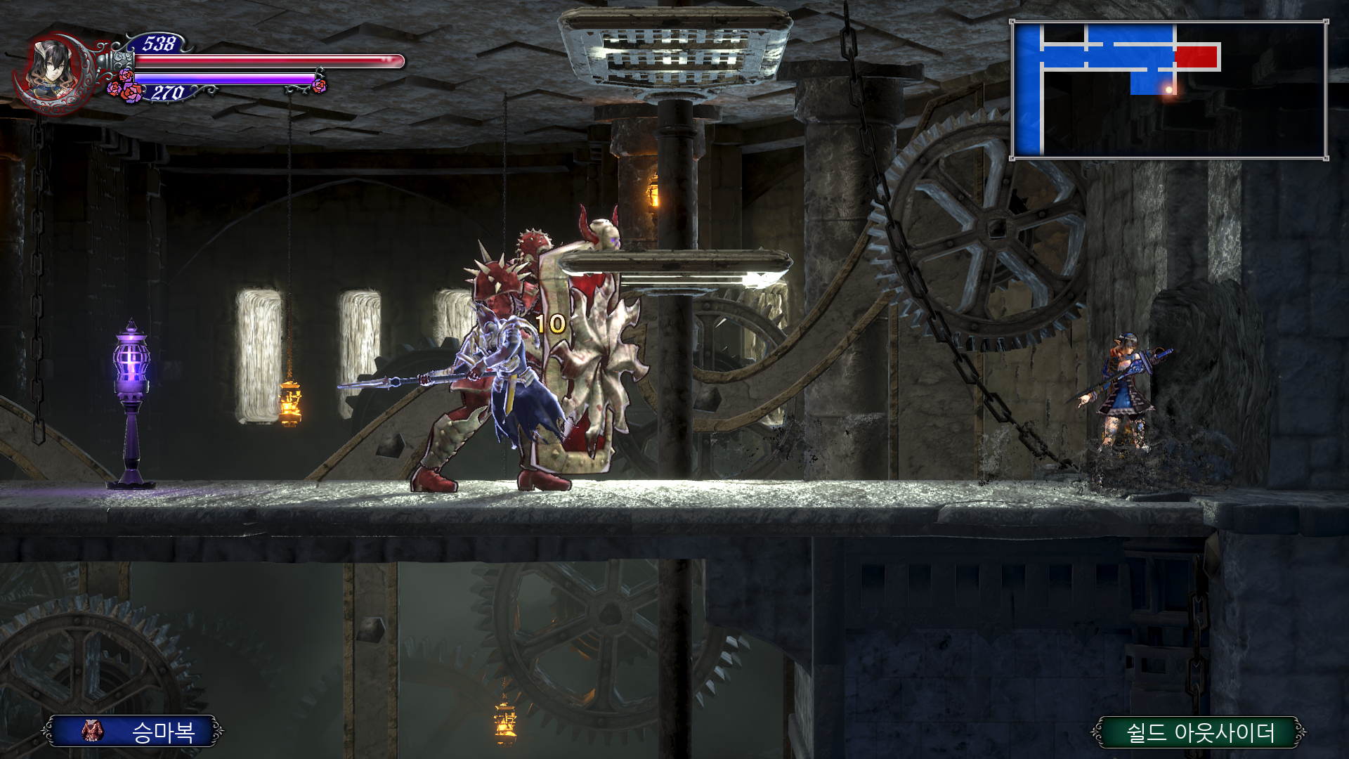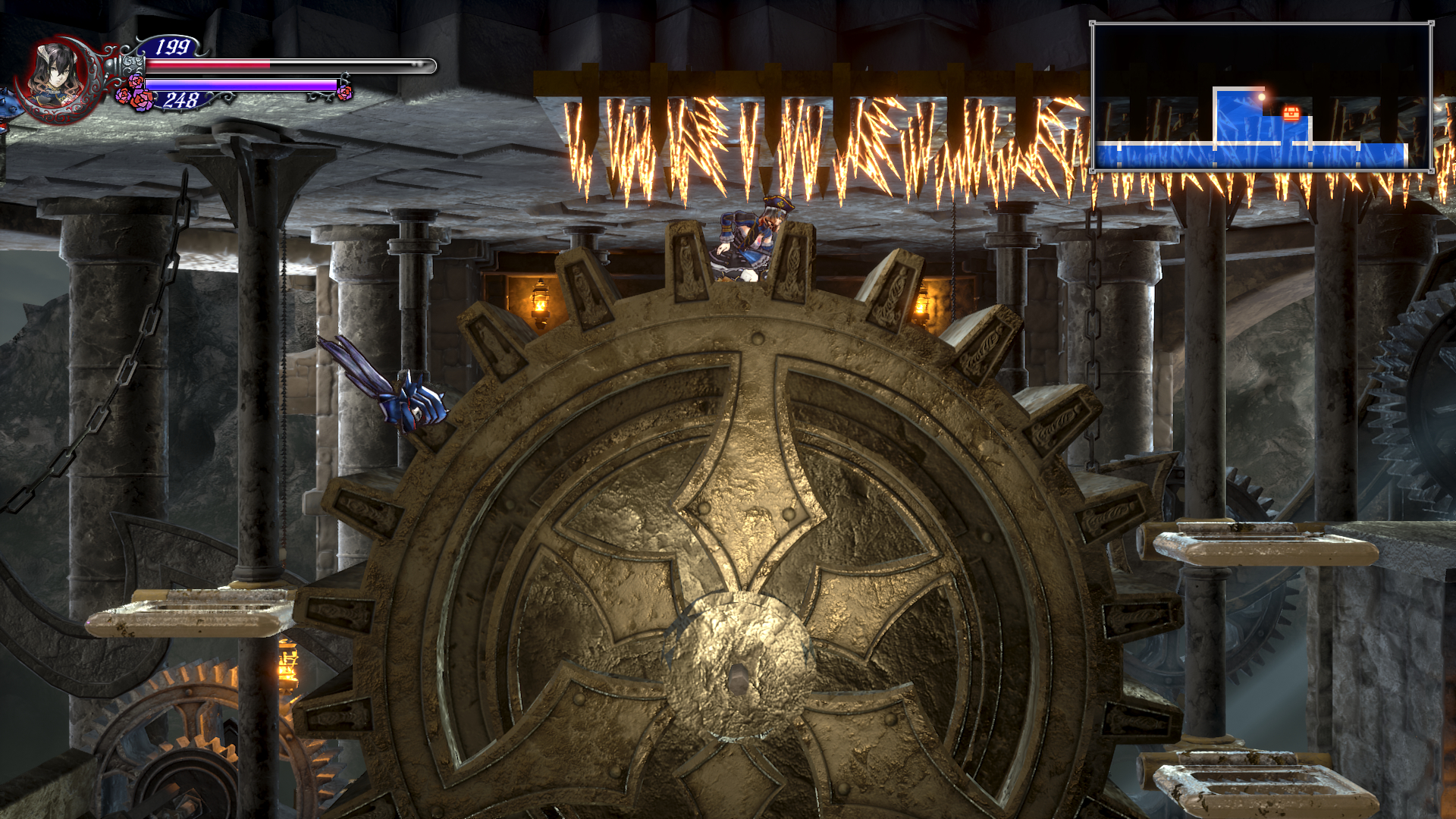 이제 더블 점프로 쌍룡의 탑을 게속 올라갈 수 있는데 여기서 칼 하나 얻고 가도록 합시다. 건물 안으로 들어가기 직전에 반대 편에 있는 톱니 바퀴를 타고 올라갑니다. 여기서 두번째 톱니 에서 위로 올라가면 HPMAX UP을 아래로 내려가면 칼을 얻을 수 있는데 여길 지나가려면 더블 점프가 필요 합니다.