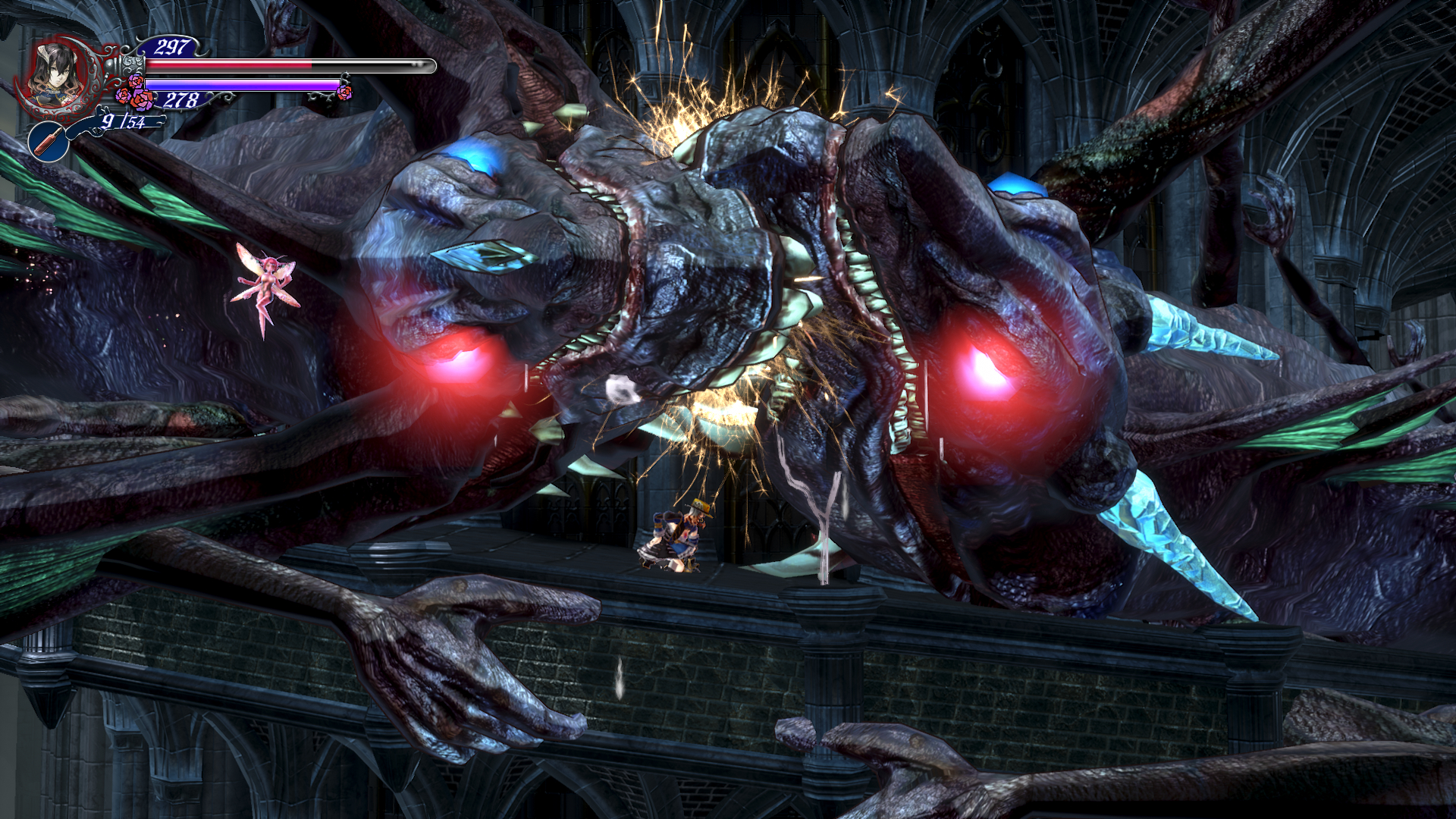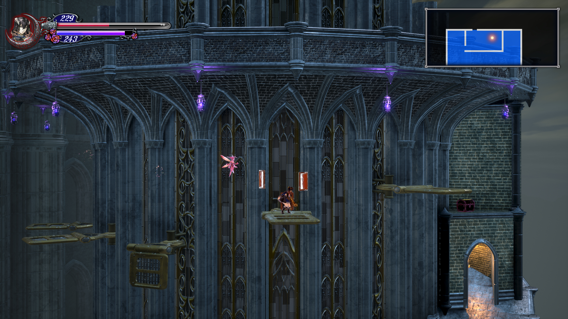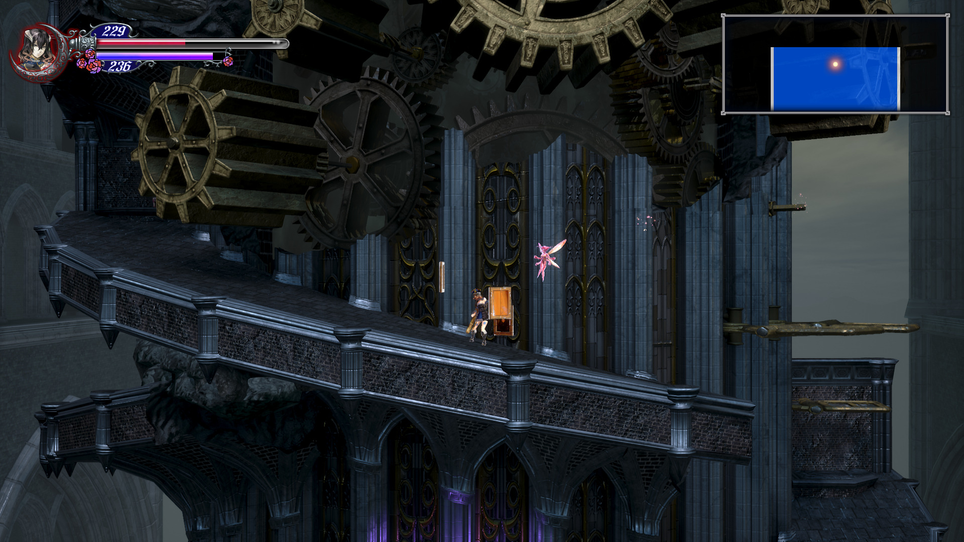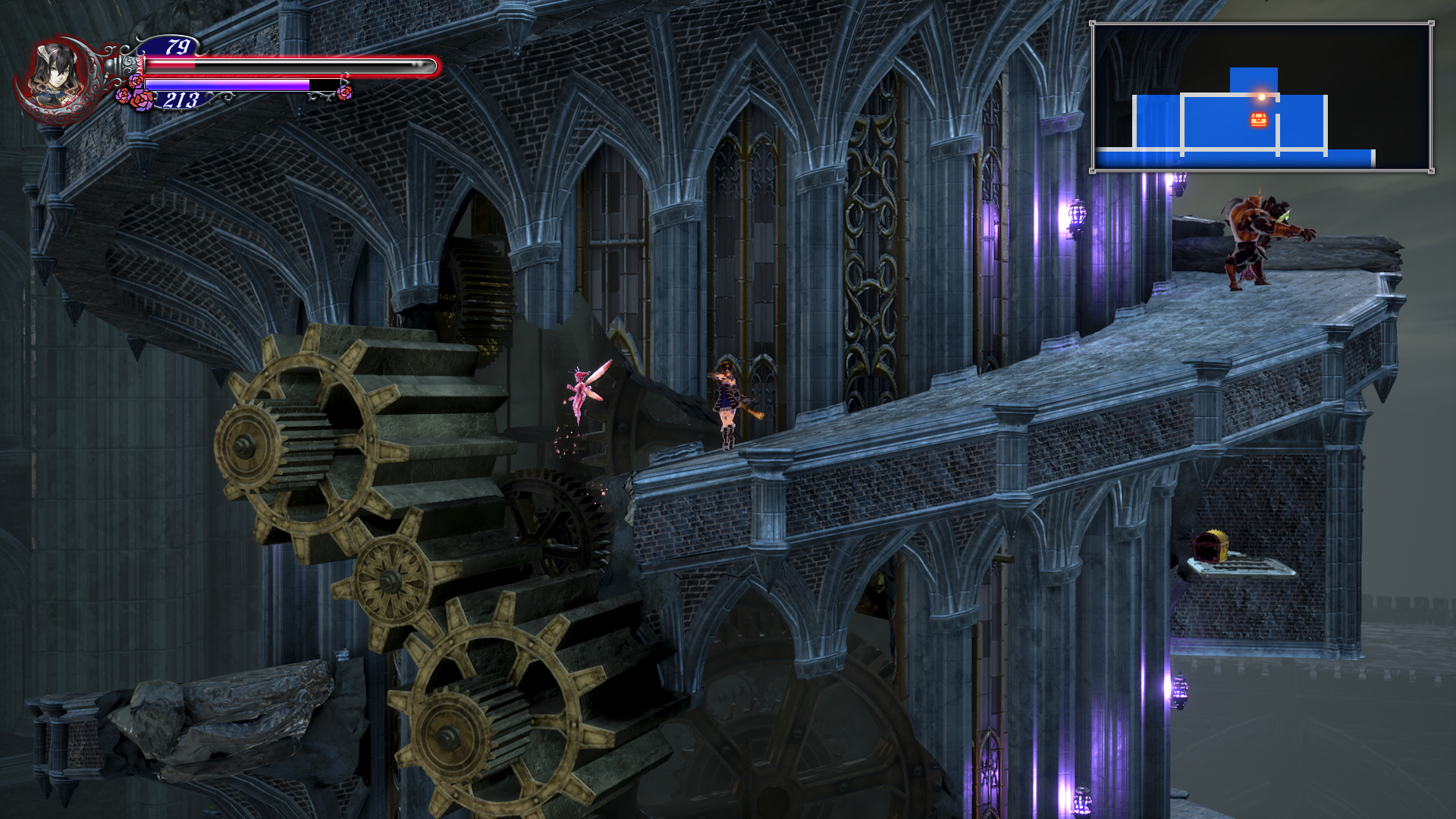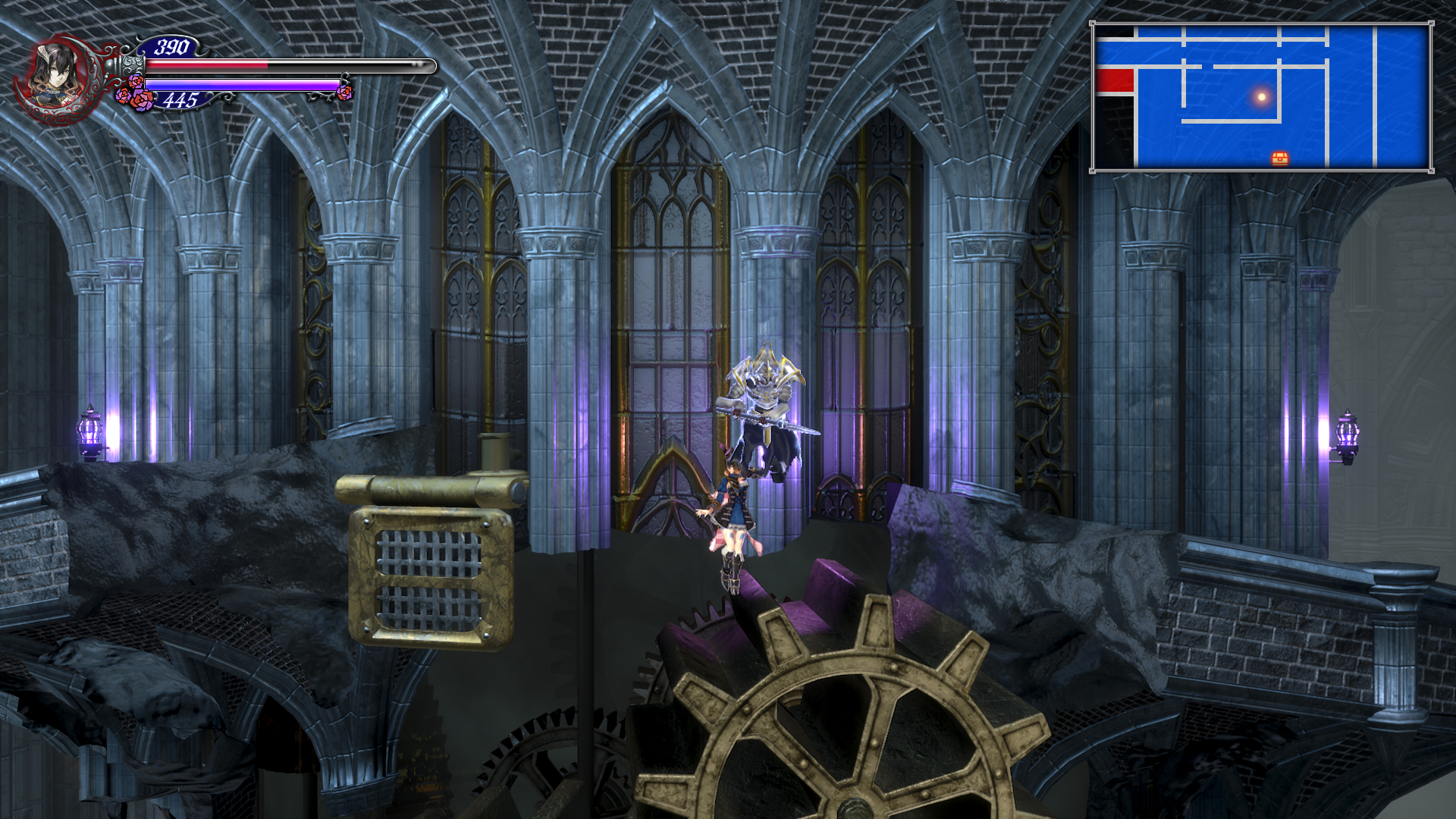 이제 더블 점프로 쌍룡의 탑을 게속 올라갈 수 있는데 여기서 칼 하나 얻고 가도록 합시다. 건물 안으로 들어가기 직전에 반대 편에 있는 톱니 바퀴를 타고 올라갑니다. 여기서 두번째 톱니 에서 위로 올라가면 HPMAX UP을 아래로 내려가면 칼을 얻을 수 있는데 여길 지나가려면 더블 점프가 필요 합니다.