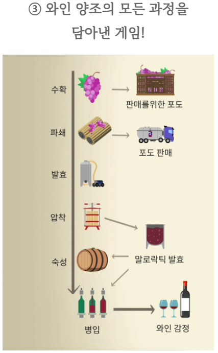 이 게임을 통해 포도 품종 선택, 제초, 가지치기, 수확, 파쇄, 발효, 압착, 숙성, 병입 등 와인 만들기의 모든 과정을 경험할 수 있다. 와인 양조라는 것이 결코 쉽지 않은 작업이라는 것은 익히 들어 알고 있었으나, 게임을 플레이하다 보면 정말 생각보다 복잡한 과정들이 다수 산재해 있다는 것을 몸소 느끼게 된다. 그간 알고 있었던 지식들이 빙산의 일각으로 여겨질 정도로.