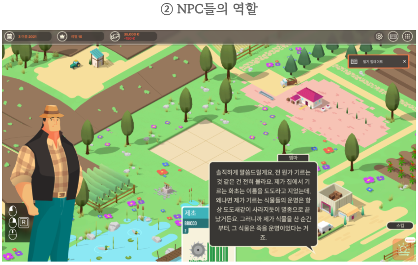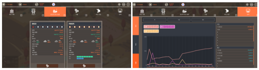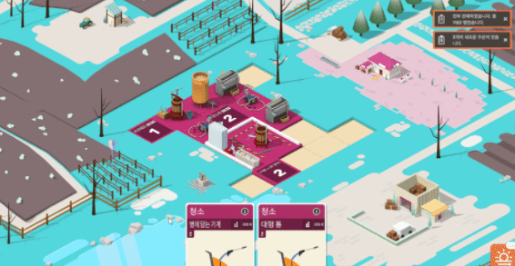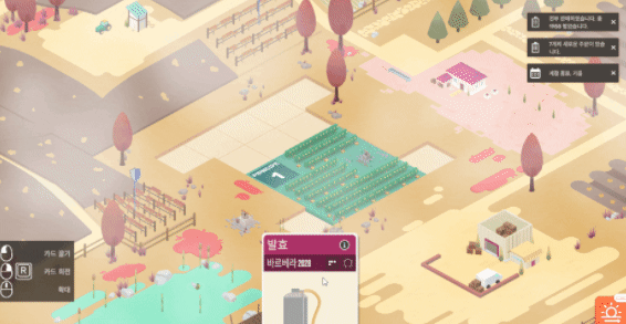 위 움짤에서 볼 수 있듯, 모든 작업은 정해진 영역에 테트리스 블록 느낌의 카드를 밀어 넣는 형태로 진행된다. 각 공정 시기에 맞춰서 이러한 카드들이 자동으로 덱에 쌓이지만, 땅의 넓이 자체가 한정되어 있으므로 원하는 행동을 원하는 시기에 자유롭게 할 수 없는 경우가 종종 발생하는 것. 업그레이드를 통해 밭을 넓혀나가면, 조금씩 숨통이 트인다.