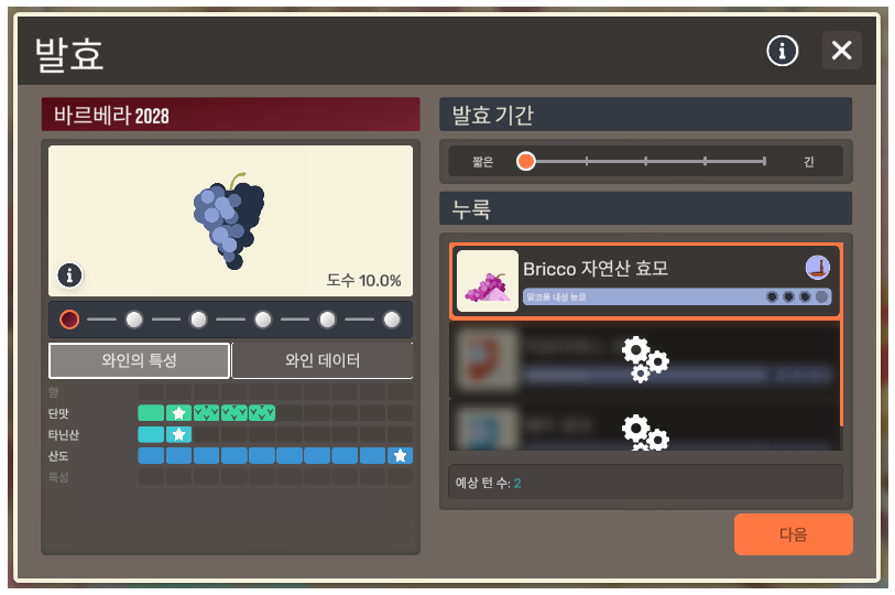 또 다른 예로, 발효과정을 살펴보도록 하자. 발효 기간 및 어떤 효모를 이용하냐에 따라 와인의 단만, 탄닌산, 산도 등 중요 속성들이 크게 변한다. 각 품종의 와인들은 제각각 일종의 '정답 스탯'이 존재하는데, 이는 위 스크린샷에서 볼 수 있듯 ★모양으로 표시된다. 모든 공정을 예민하게 관리하며, 저 스탯을 맞추는 것이 가장 중요!