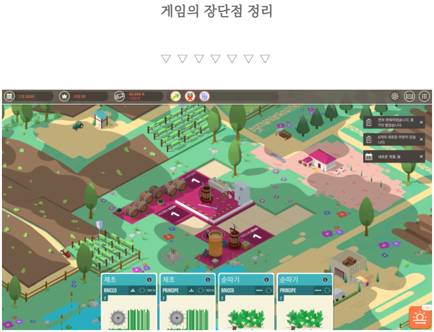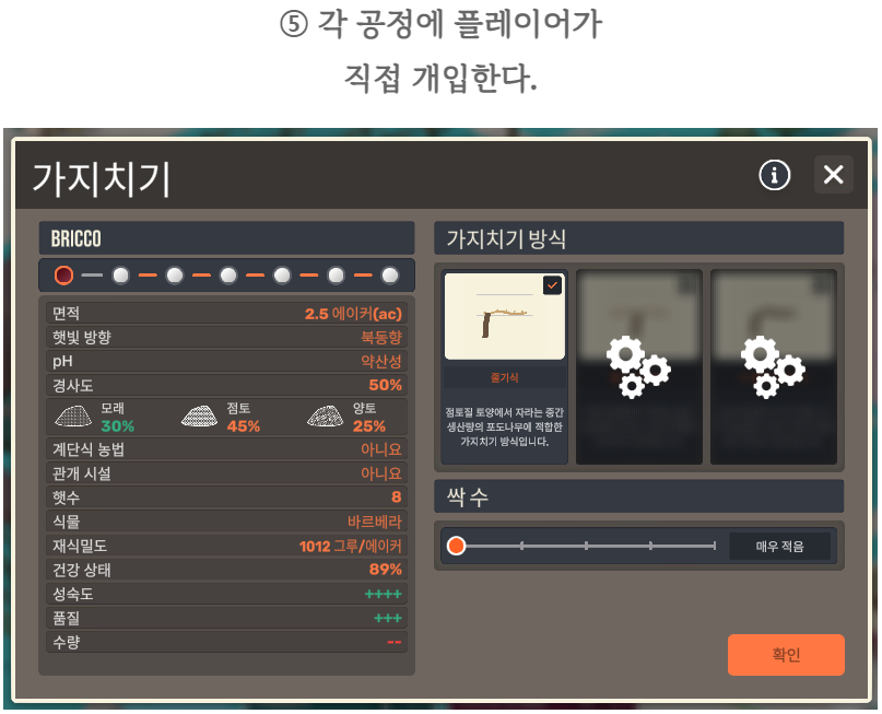 밭에 가지치기 카드를 배치할 경우, 일정 작업 턴이 지난 뒤에 위와 같은 디테일한 메뉴 팝업이 송출된다. 싹을 적게 남기면 포도의 품질이 높아지면, 싹을 많이 남기면 품질이 떨어지는 형태이다.이처럼 와인 양조에 필요한 대부분의 작업들에 플레이어의 의사결정이 큰 영향을 미친다.