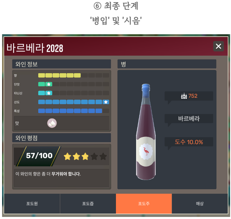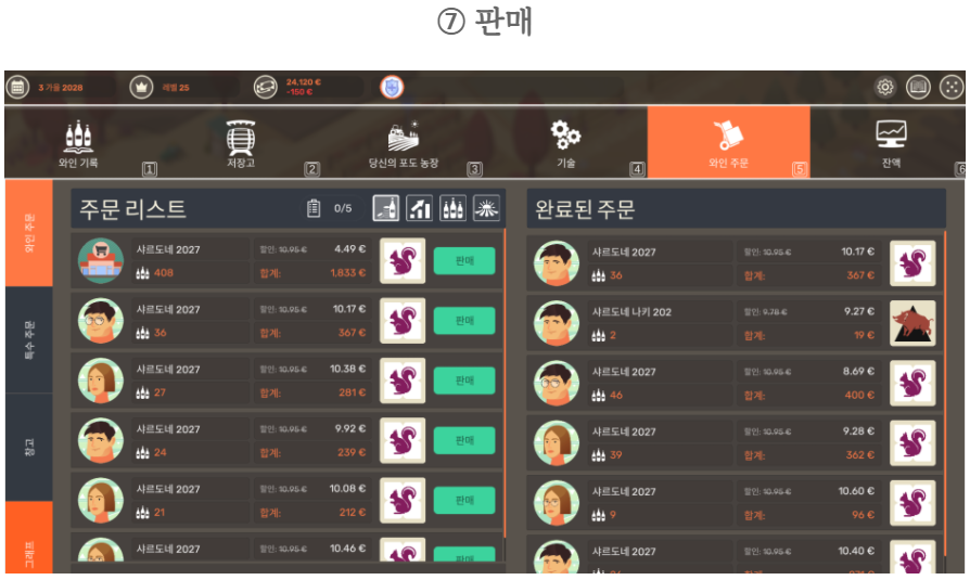 와인기록 메뉴를 통해 그간 생성하고 판매한 와인들의 점수와 특징을 살펴볼 수 있다. 이를 타산지석 삼아 더 높은 점수의 와인을 제작하고, 판매하는 루틴이 반복된다.