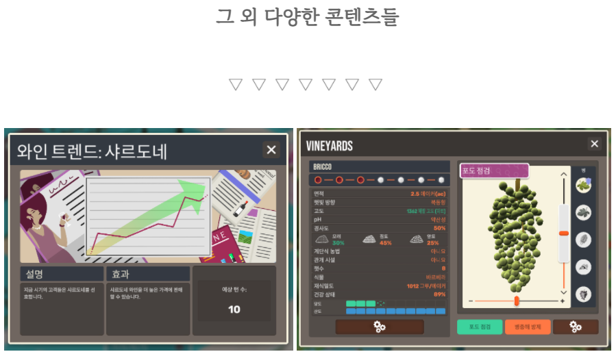 앞서 설명한 기본적인 공정에 대한 내용들 외에도, 특정 시기에 일부 품목의 유행이 발생하는 '와인 트렌드' 이벤트 및 전염병 이벤트, 특수 퀘스트 등 다양한 시스템들이 게임에 풍성한 느낌을 더한다.