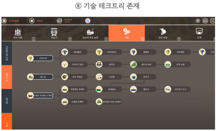 해당 게임에는 포도 품종 및 각종 도구, 창고, 마케팅 등 테크트리를 업그레이드하는 시스템이 추가로 존재한다. 늘 같은 공정을 반복하는 게임 특성상 자칫 단조로움이 느껴질 수 있는데, 이러한 기술 업그레이드 시스템 덕분에 동기부여 요소가 추가되는 것이다. 덕분에, 상당히 긴 시간 동안 크게 지루한 느낌 없이 게임을 즐길 수 있다.
