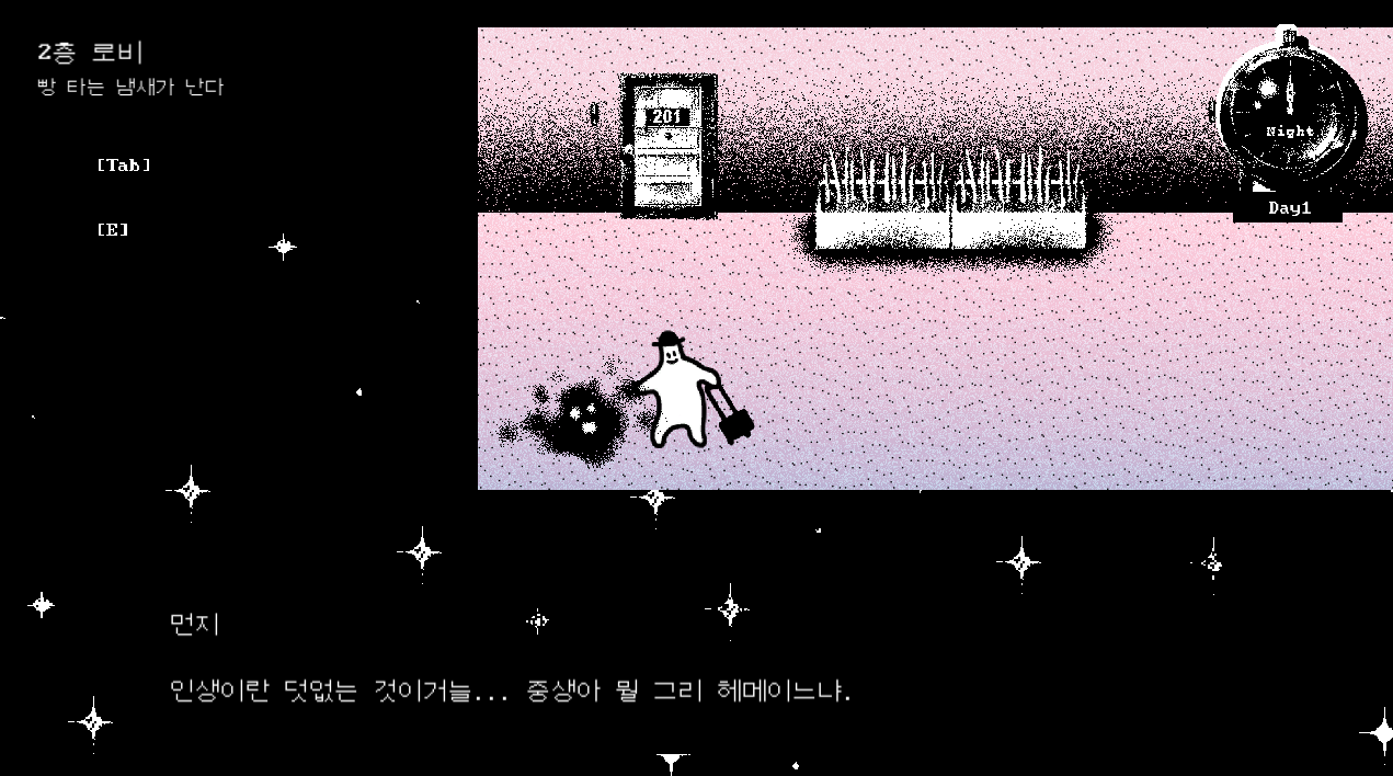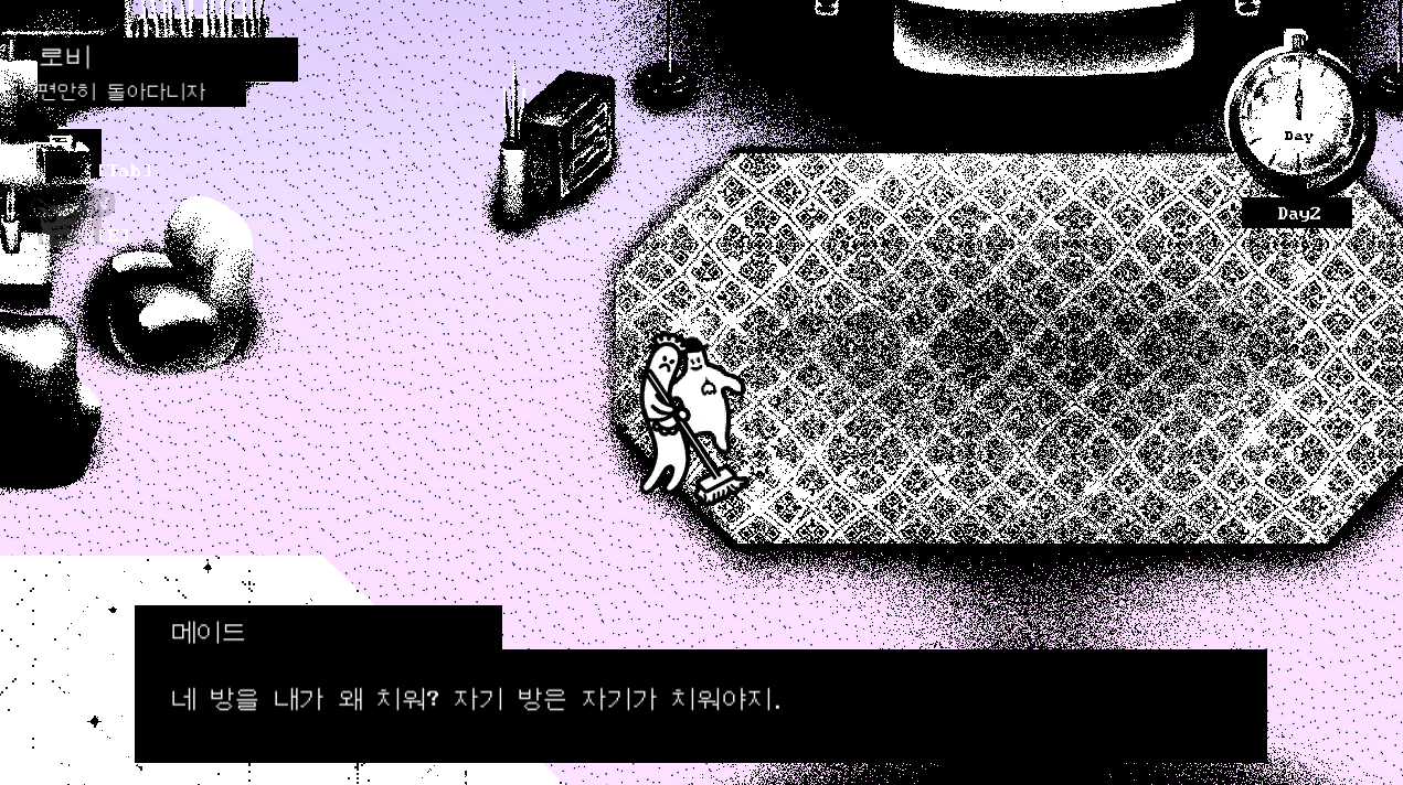 게임의 전체적인 분위기는 유머러스하다. 케찹(주스)가 되고 싶어하는 토마토, 터진 풍선을 보고 풍선이 죽었다고 묘사하는 등의 요소는 어쩐지 코믹하면서도 오묘한 기분이 든다. 주인공이 그리 놀라하지 않는 것으로 보아 인간 외의 것이 말하고 움직이는 것이 호텔에서만 일어나는 일은 아닌 듯 하다. 처음 호텔에 온 직후 만난 직원들은 재밌는 사람처럼 보이나, 다음날 만나는 호텔의 직원들은 대부분 책임감이 없으며 주인공이 돌을 잃어버렸다고 항의해도 시큰둥하게 대응한다. 처음 부분은 이해하기 힘든 수준의 유쾌함만 느껴지나, 조금만 파고들어보면 호텔이라는 공간이 정상적으로 돌아가지 않음을 알게 된다. 이런 스타일의 게임이 그렇듯 어지러운 호텔 여기저기에는 호텔의 과거와 연관있는 쪽지들이 대놓고 떨어져있다. 조금만 스포일러를 하자면 이야기의 진상에 접근하면 할 수록 일종의 코스믹 호러같은 분위기로 장르가 느껴진다. 예상대로 그 호텔은 평범한 숙소가 아니었던 것이다.