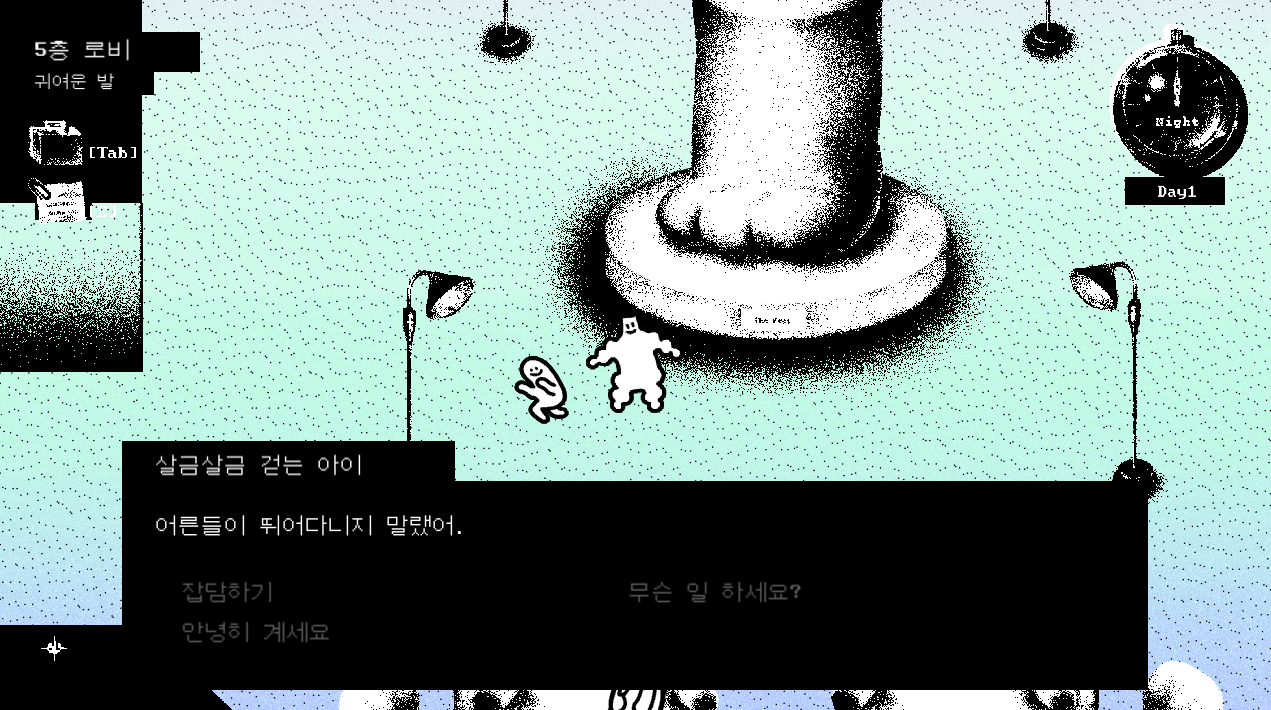 캐릭터들이 대충 그린 카톡 이모티콘처럼 하찮게 생겨서 어쩐지 귀여운 느낌을 주지만 동시에 어쩐지 노이즈가 낀 특유의 표현법 탓에 뭔가 무서운 기분이 들기도 한다. 그러나 게임 자체는 미스터리한 분위기가 나올 뿐 갑자기 튀어나오는 요소는 없어서 무서운 걸 영 못하는 사람들도 충분히 엔딩까지 다다를 수 있다.
