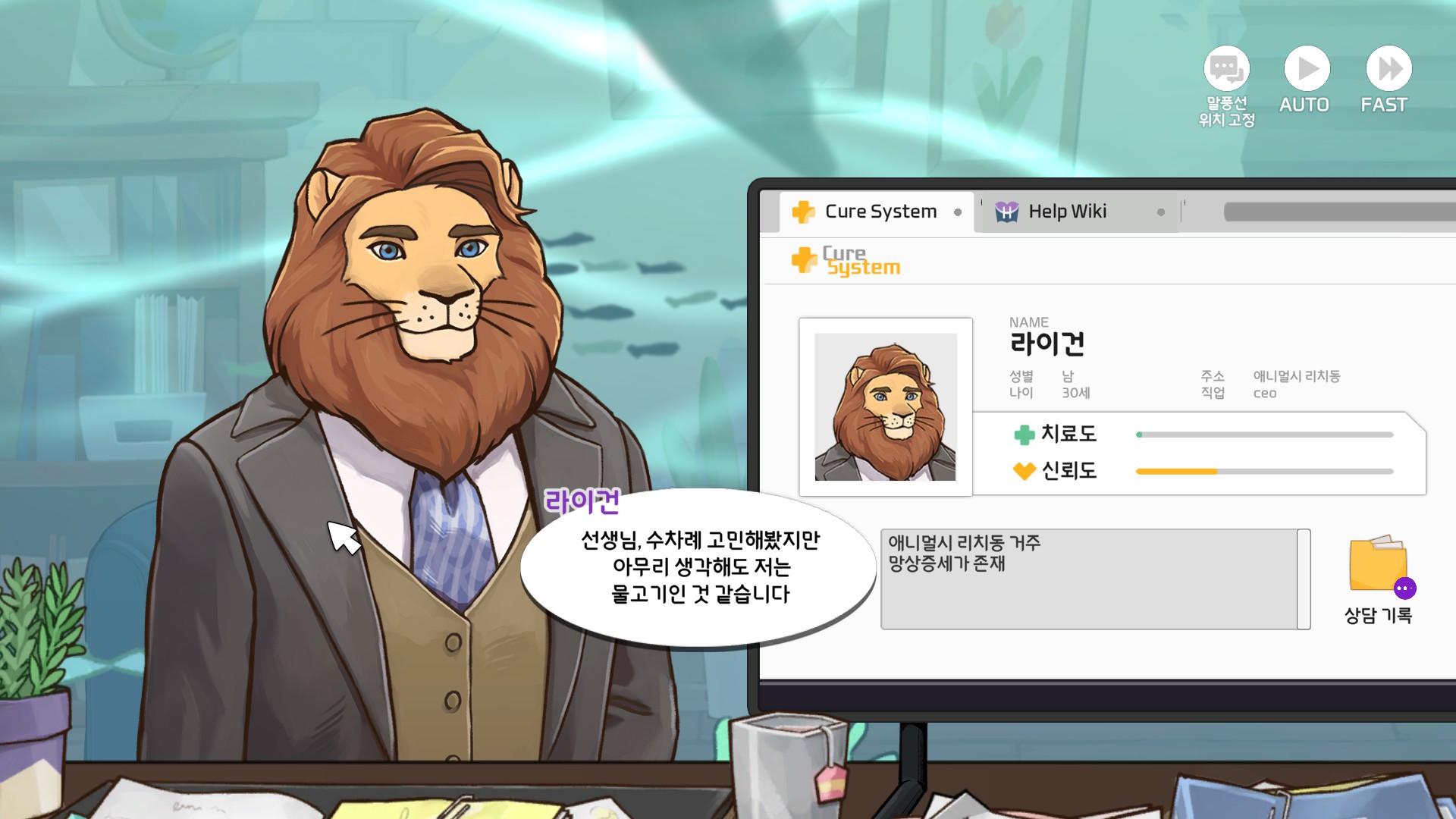 여러 명의 환자 중 미니 게임만 계속 깨도 치료도가 상승하는 단순한 환자도 있지만, 일부 중요한 환자는 상담을 하는 기간 내내 대화 그 자체가 중요한 케이스가 있다. 사자 라이건(자신이 물고기라는 망상에 사로잡혀있음), 돼지 나루(막노동에 종사하다가 최근 불면증에 시달림), 그리고 정식판에 추가된 흑표범 루시엘라(병원에는 그냥 놀러왔다고 하는데...)이 바로 그들이다. 사는 환경이 다른 이들은 각기 다른 증상을 가지고 있고, 왜 그런 질환에 시달리게 됐는지에 대한 숨은 이야기가 있다. 치료도와 신뢰도를 완벽하게 채우면 가장 긍정적인 결말이 나오지만 그렇게 하지 못해도 나름의 방식으로 문제를 끝맺는다.