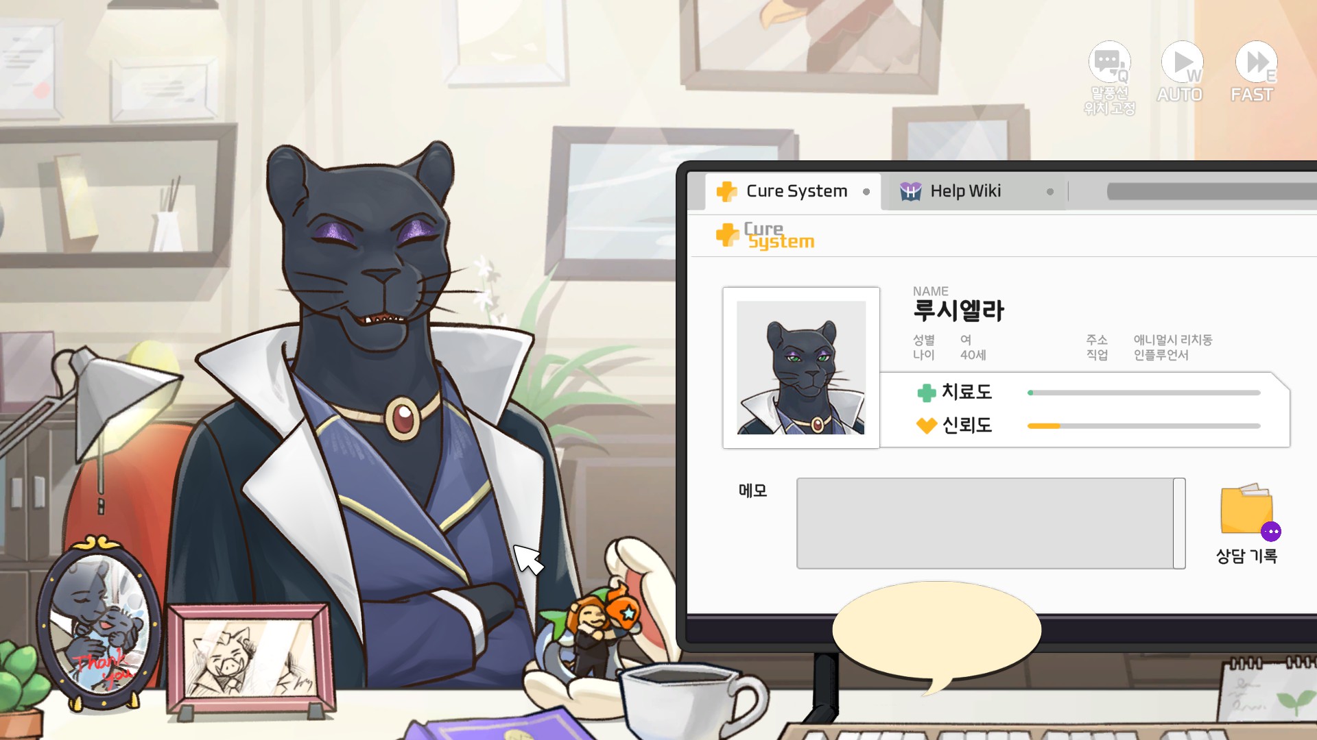 정식 출시가 되어 예고된 대로 많은 캐릭터들이 등장한 점은 긍정적으로 볼 수 있다. 그러나 여전히 상담을 해볼 수 있는 동물은 그렇게까지 많아 보이지 않았다. 이런 스타일의 게임은 흔하디 흔한 비주얼 노벨처럼 상대를 무작정 찍어내서는 안된다는 단점이 있다. 아무리 의학의 내용을 100% 담지 못한다고 하더라도 검증된 시나리오를 가진 인물만 넣어야 할 것이며, 많은 캐릭터를 창조해내기란 어려운 일임에 틀림 없다. 그럴 것이라면 차라리 병원을 운영하는 '나'의 이야기를 넣었다면 이야기가 더 풍부해지지 않았을까 하는 생각이 든다. 내가 어떻게 해서 의사가 됐고, 환자와의 만남을 통해 심경에 어떤 변화가 생겼는지를 묘사하는 것도 충분히 사람들에게 위로가 되는 스토리텔링이 되지 않을까 하는 생각이 들었다.